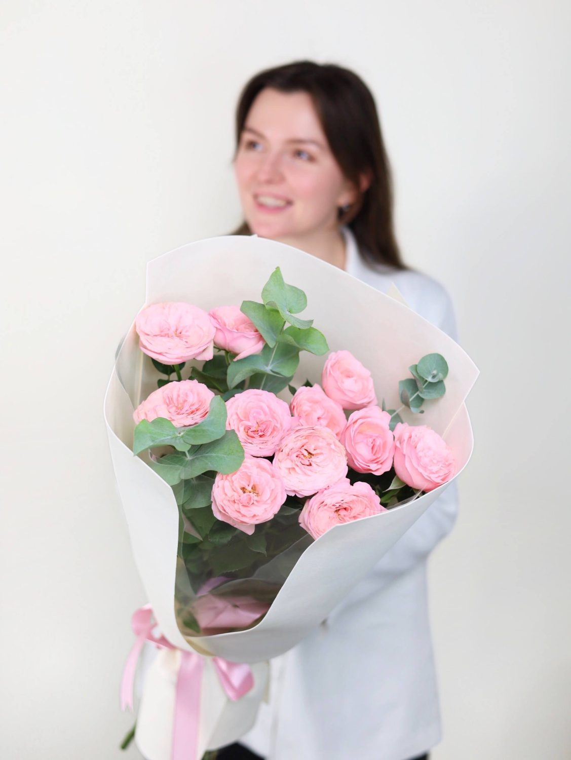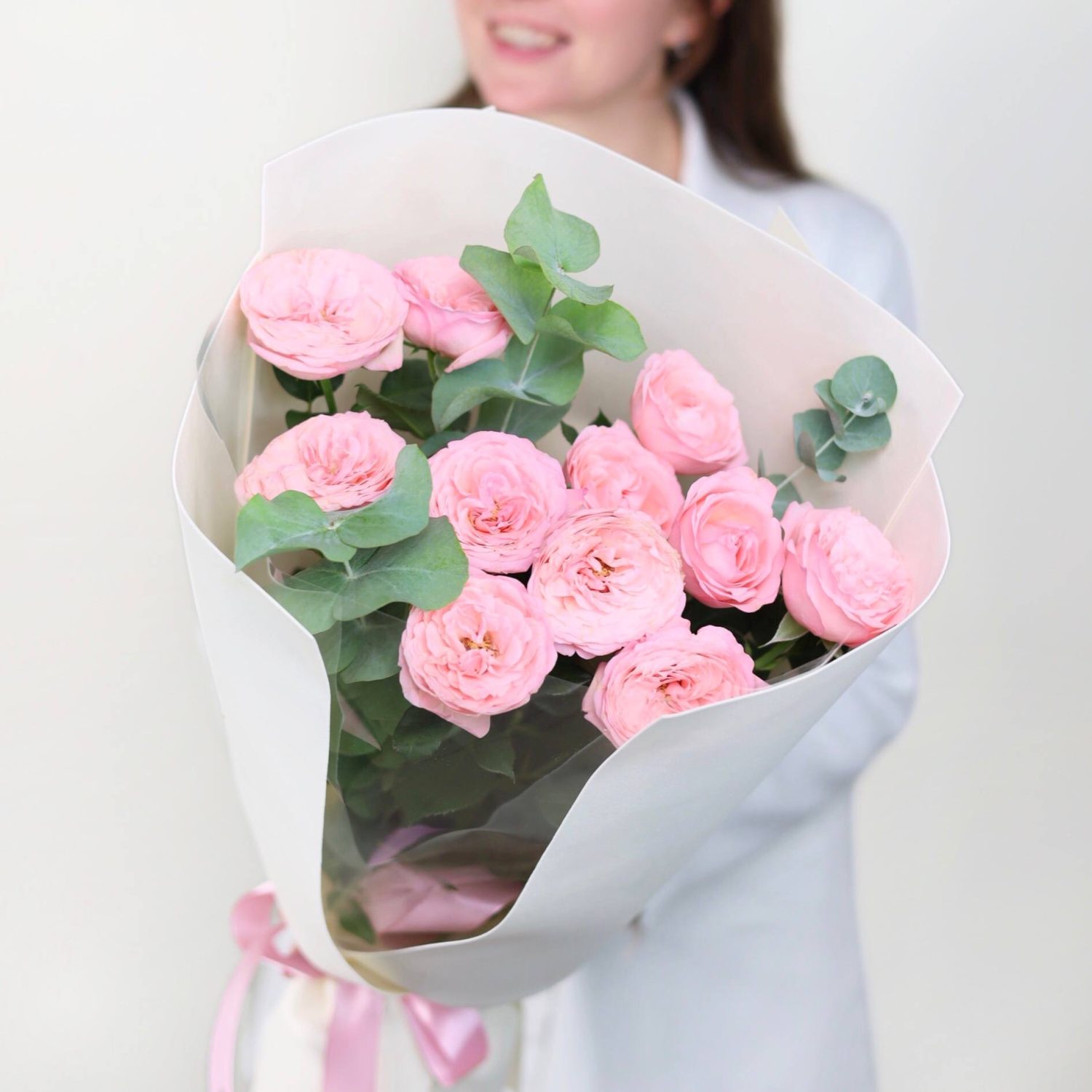 Очаровательный букет кустовых пионовидных роз с душистым эвкалиптом в оформлении.