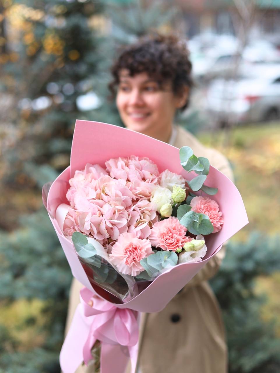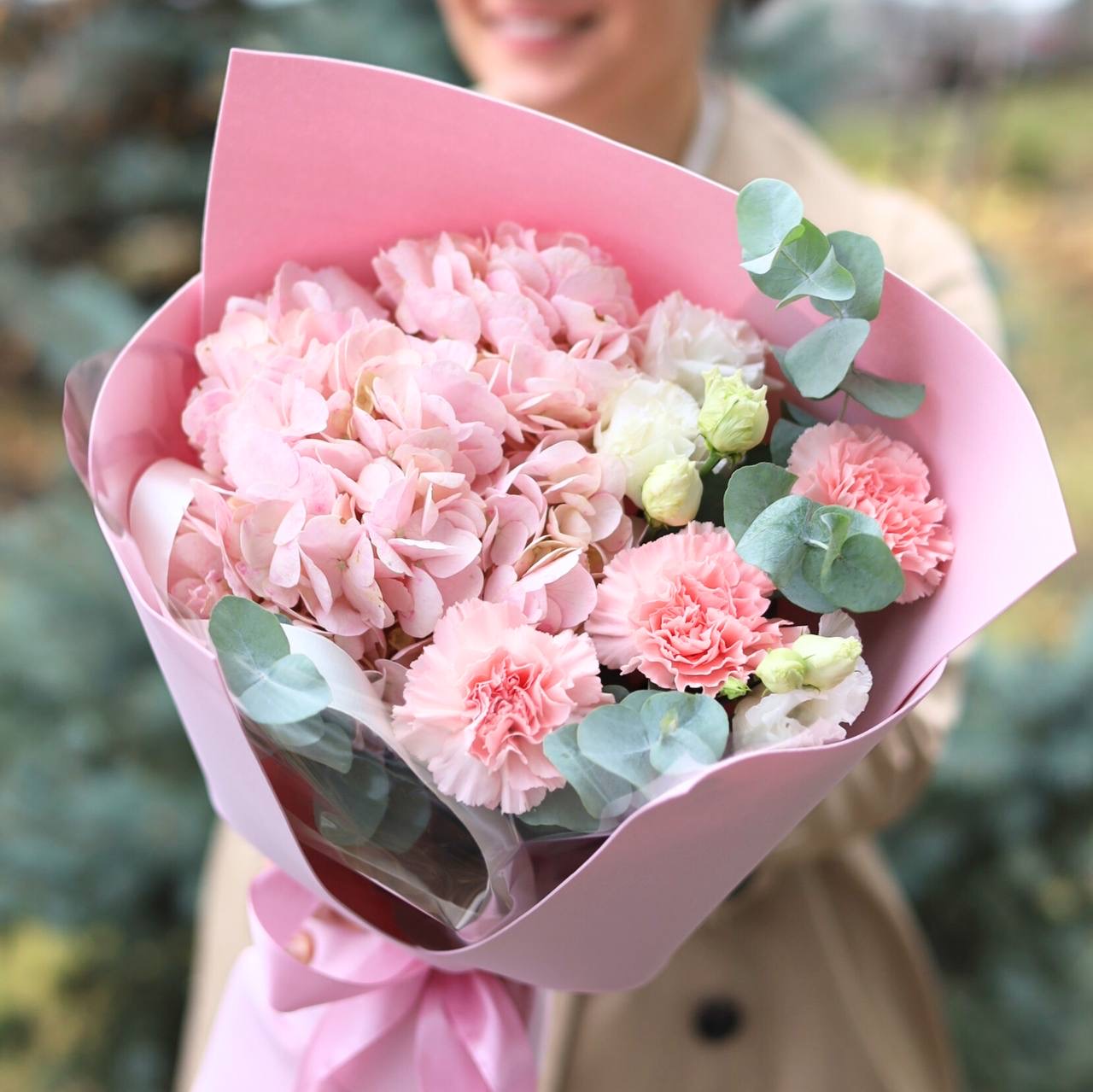 Состав: пышная гортензия, стойкие диантусы, эустома, эвкалипт.