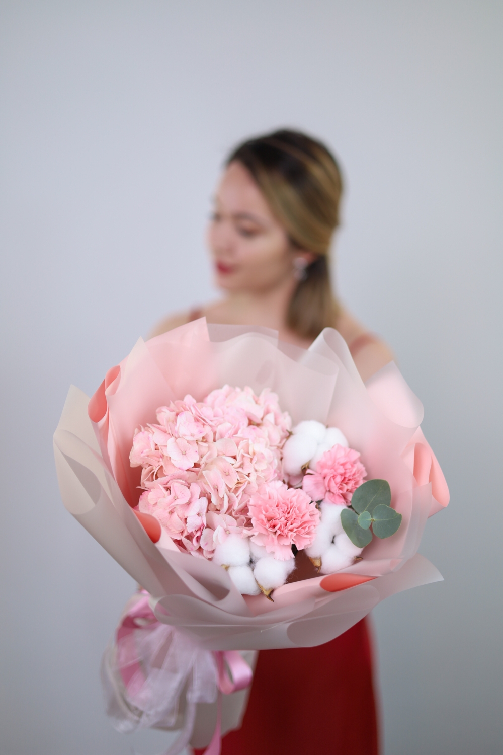 Состав: пышная гортензия, стойкие диантусы, хлопок, эвкалипт.