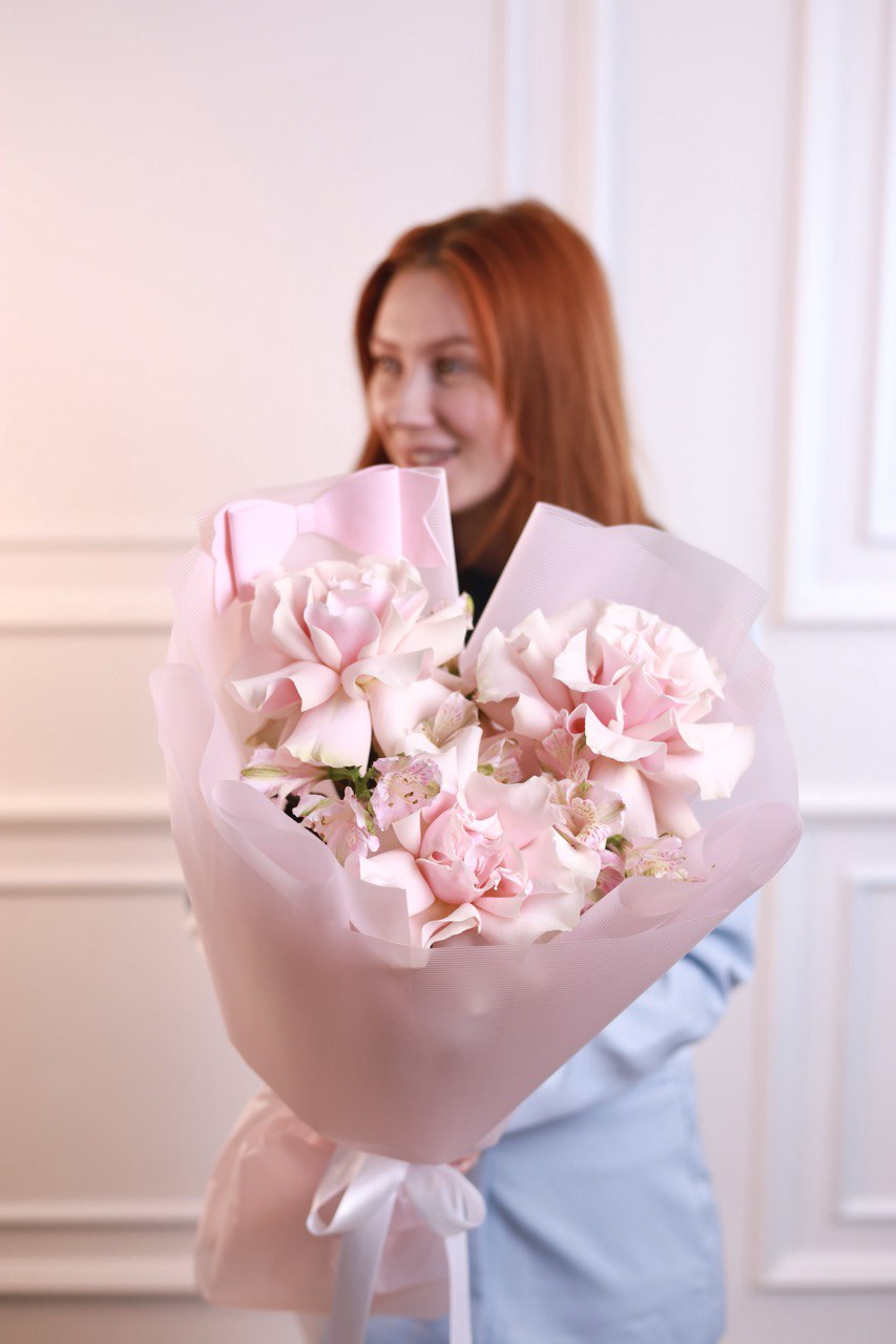 Очаровательный букет из 3-х нежных французских роз с нежной альстромерией в оформлении.