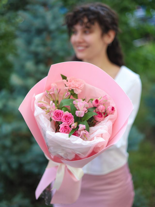 Состав: кустовые розы, стойкие диантусы и альстромерия.