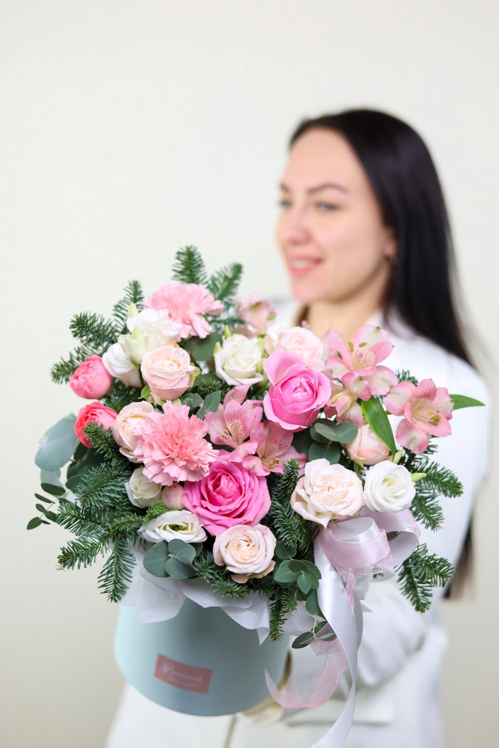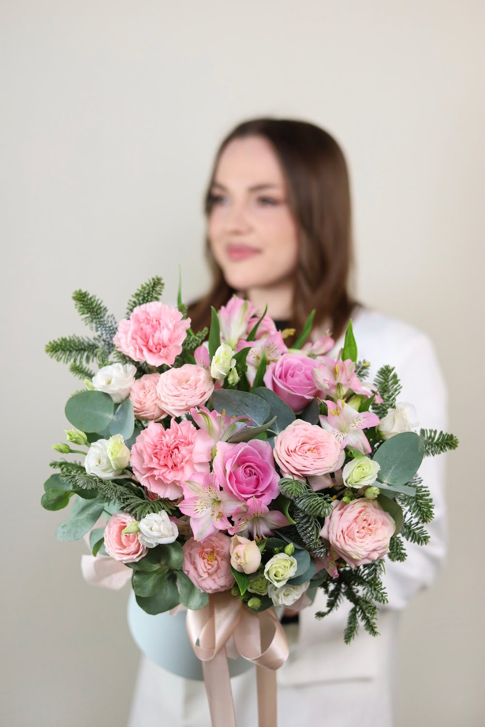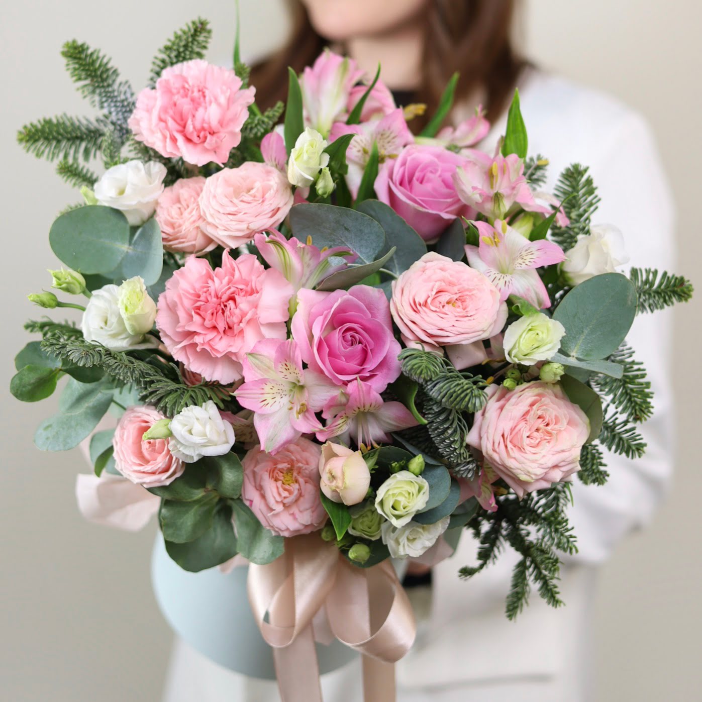 Состав: кустовые и одноголовые розы, стойкие диантусы и альстромерия, эустома, эвкалипт, натуральный нобилис. Высота около 35 см.