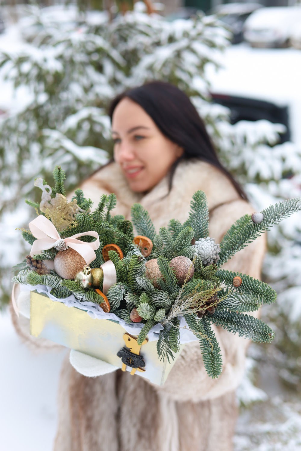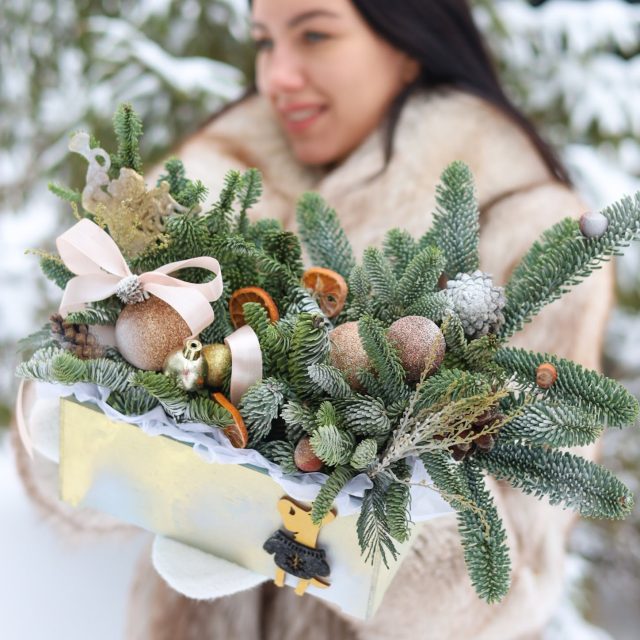 Состав: елочные игрушки, шишки, апельсины, натуральная ель нобилис. Высота около 30 см.