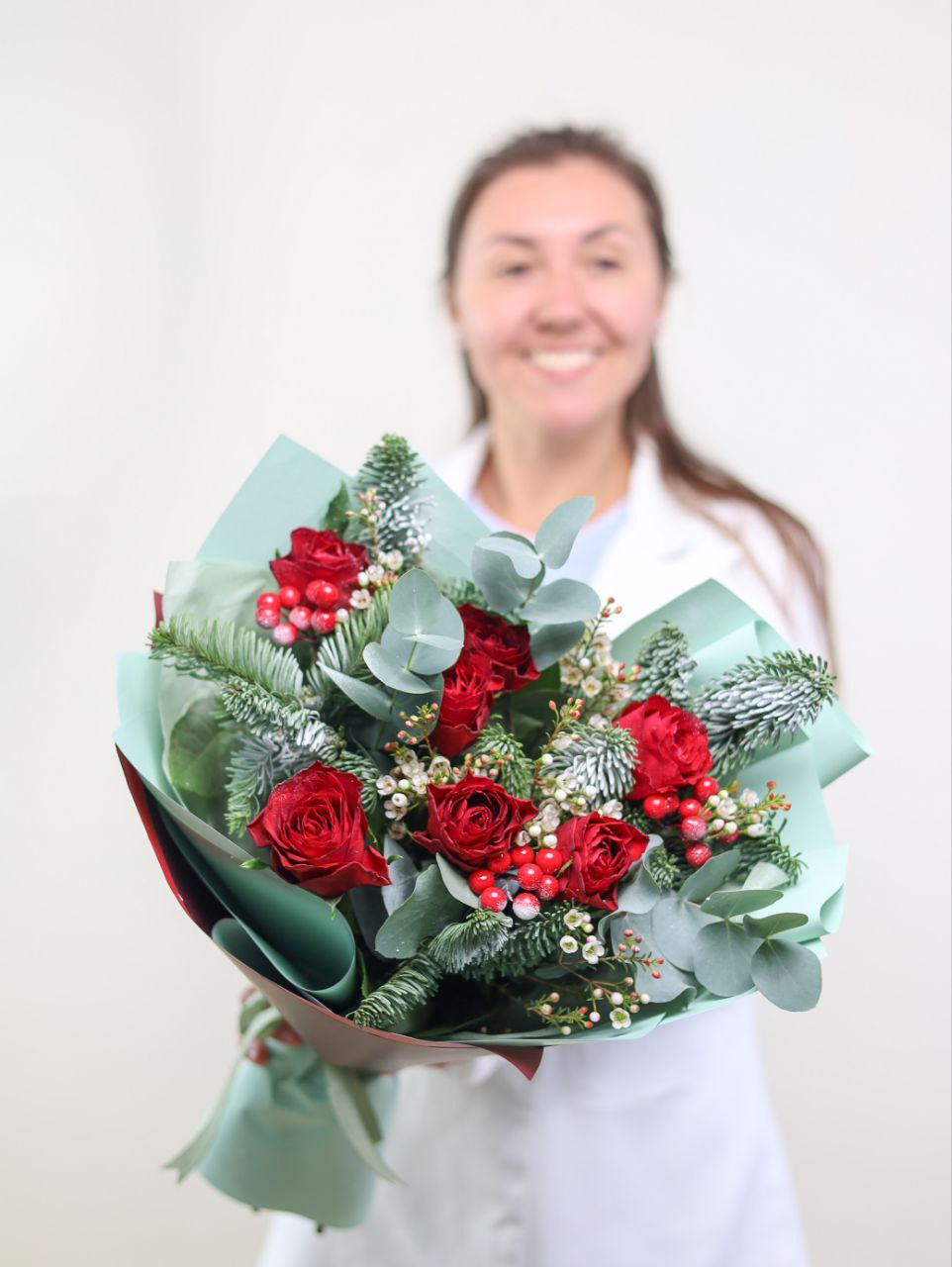 Букет роз, датской ели, хамелациума и душистого эвкалипта в оформлении.