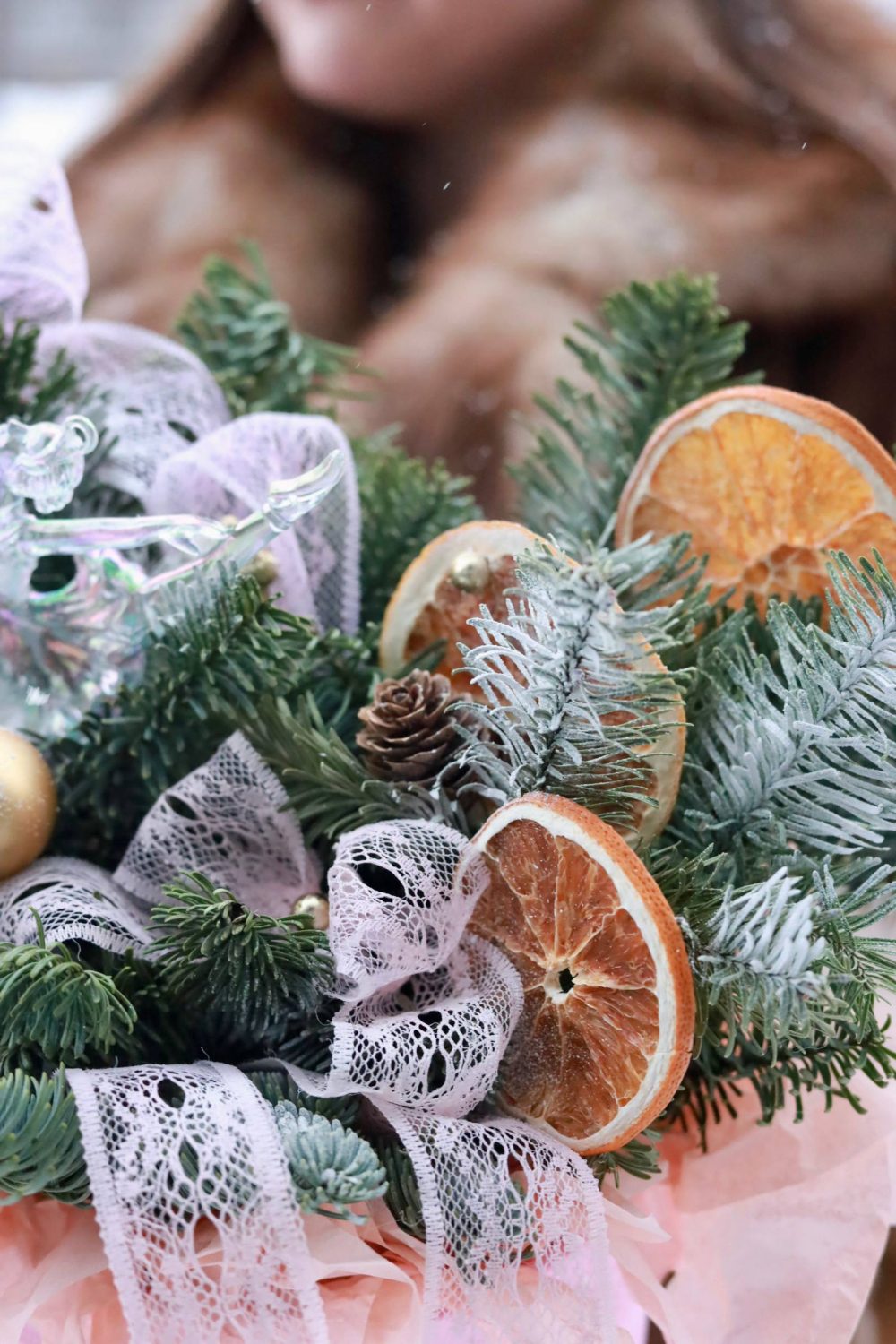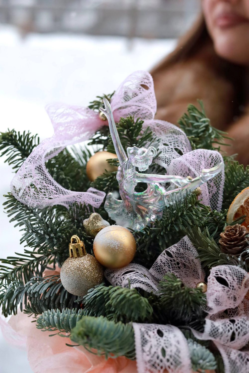 Состав: ель нобилис, апельсины, шишки, елочные игрушки, фигурка балерины.