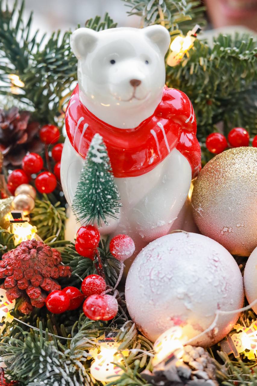 Состав: живая ель Нобилис, шишки, гирлянда в виде снеговичков, ёлочные игрушки, декор, фигурка в виде полярного медведя, леденец.