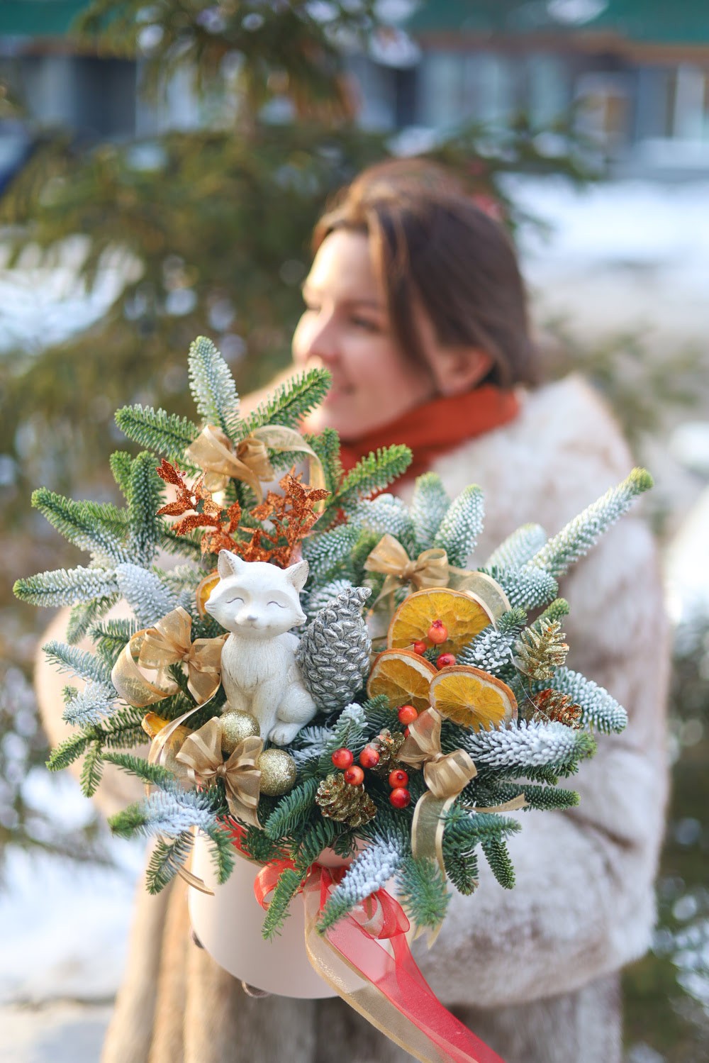 Состав: новогодний декор, сухоцветы, апельсины, натуральная датская ель нобилис, фигурка лисички. Высота около 30-35 см.