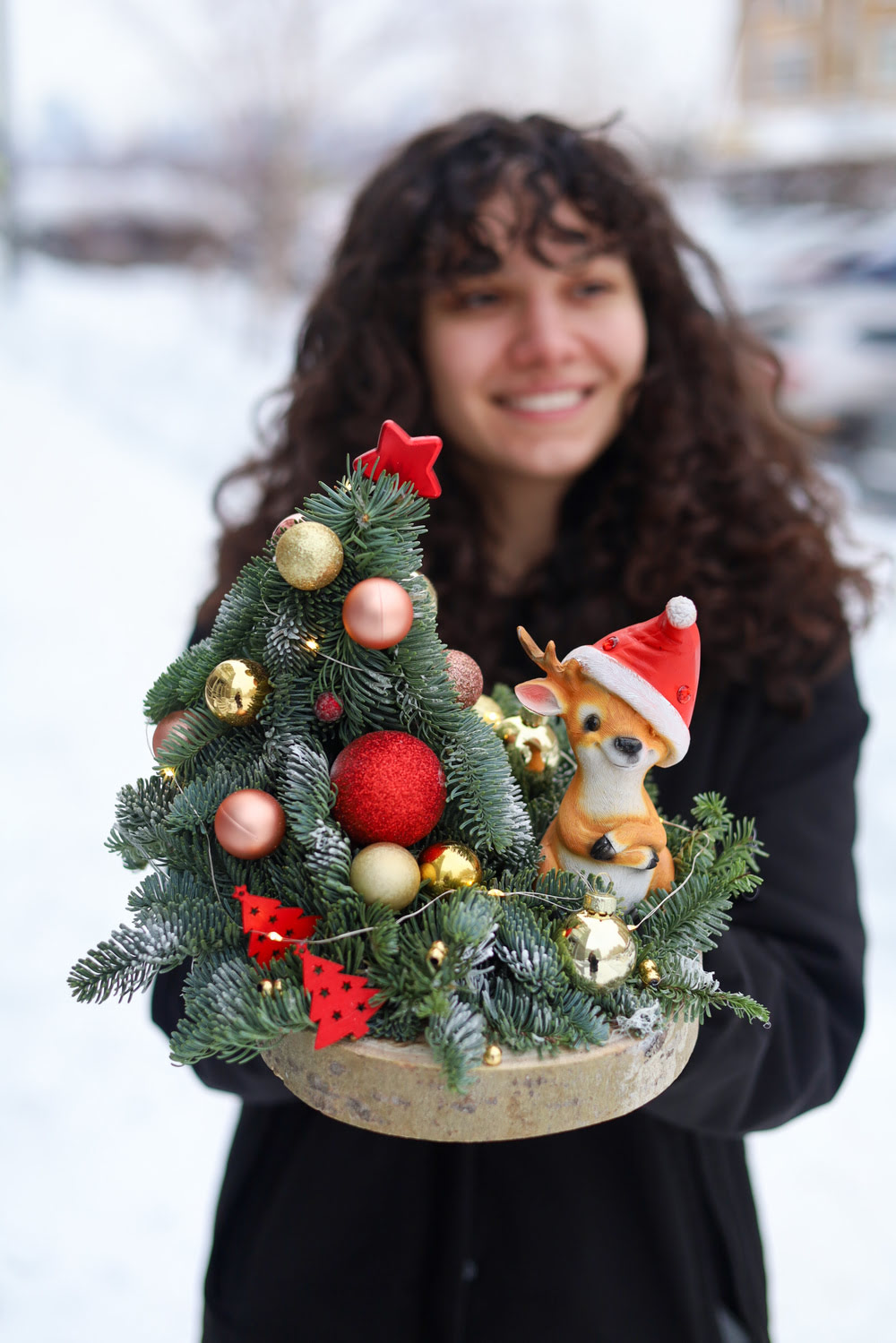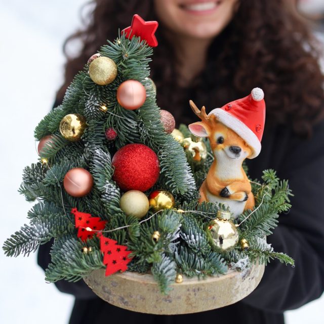 Состав: натуральный нобилис, новогодний декор, фигурка оленя. Высота около 30 см.