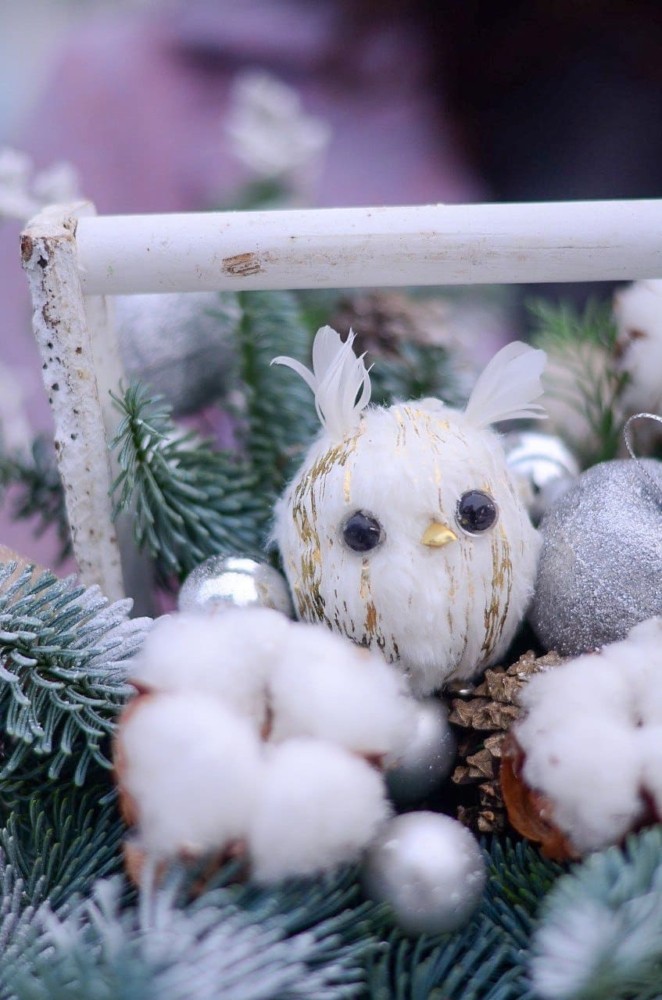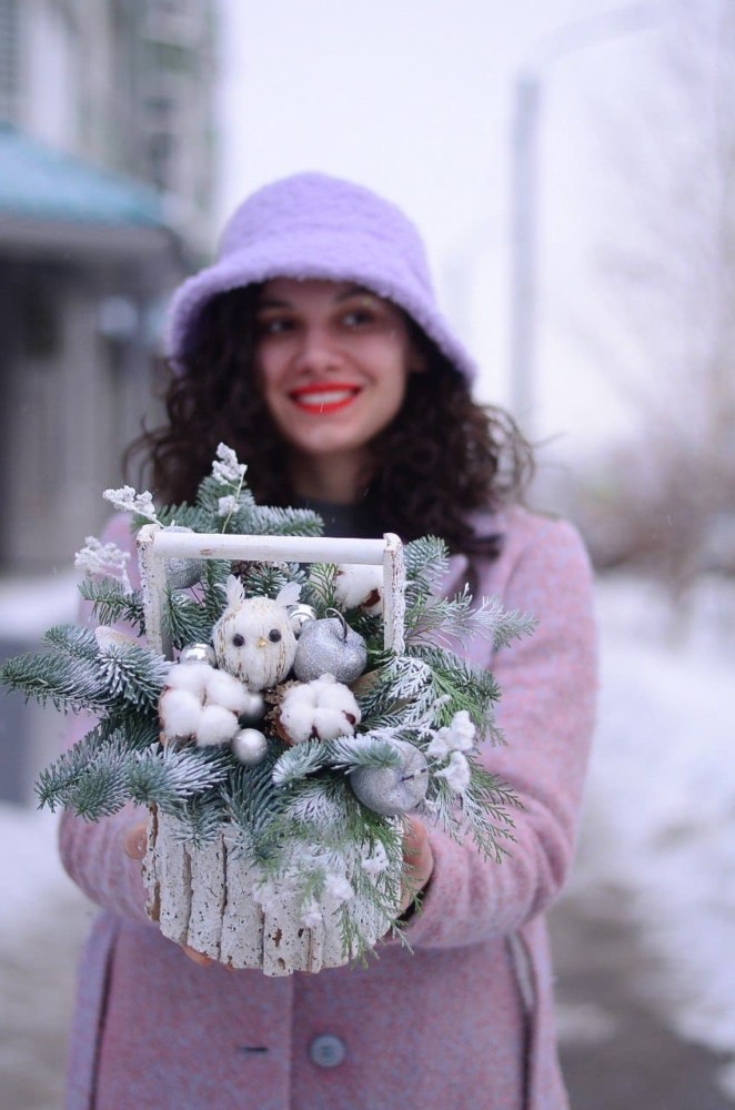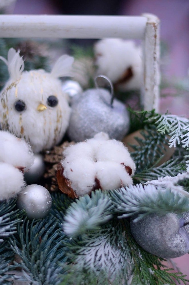 Очаровательная композиция с декоративными элементами, новогодними игрушками, хлопком, датской елью и туей в деревянном кашпо.