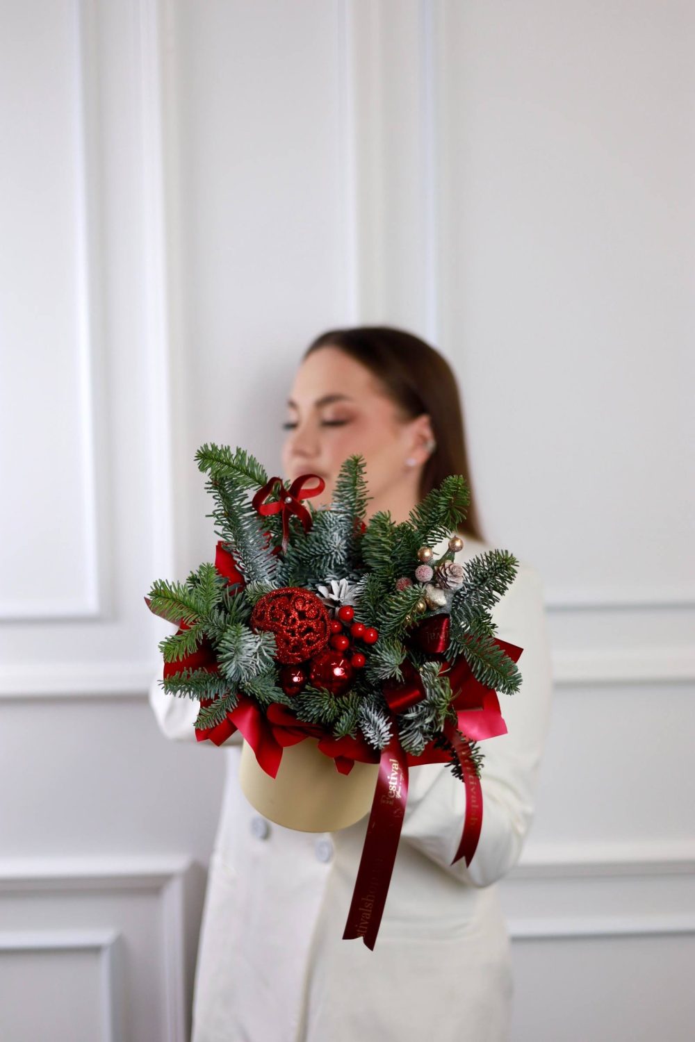 Очаровательная композиция в бордовой гамме с ароматной хвоей. Композиция подарит уют в любой дом!