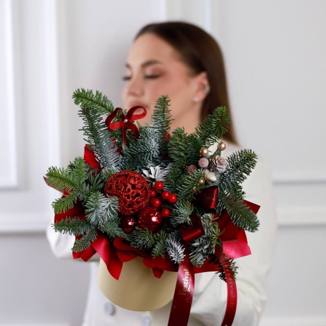 В композиции: новогодний декор, шишки и натуральный нобилис.