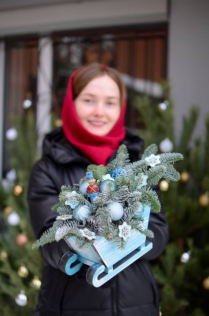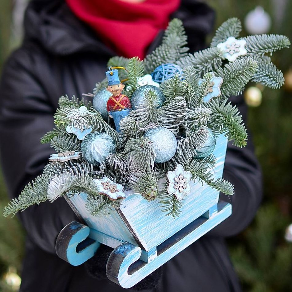 Очаровательная композиция, выполненная в кашпо в виде саней и в голубой гамме, украшенная снегом.