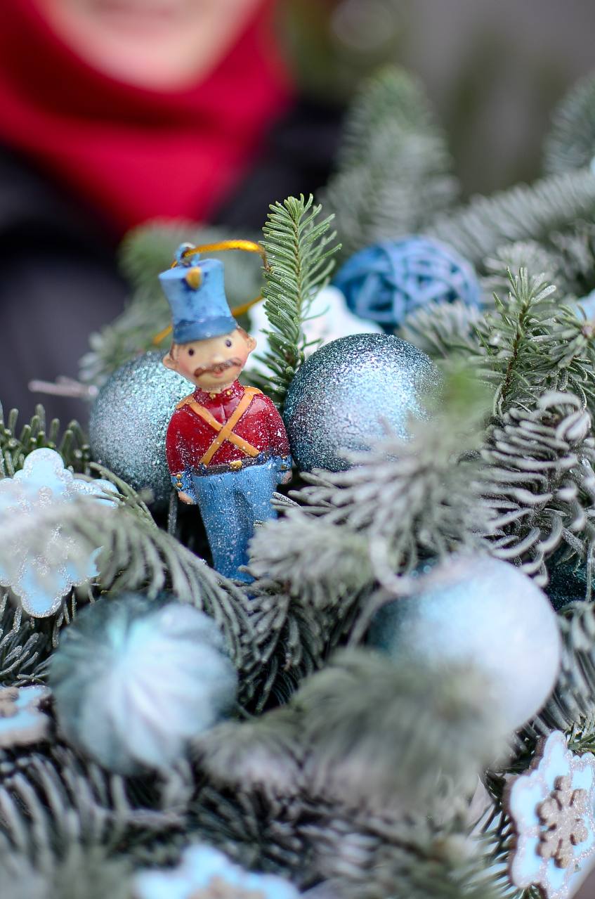 В композиции: натуральный нобилис, зимний декор, игрушка солдатика.