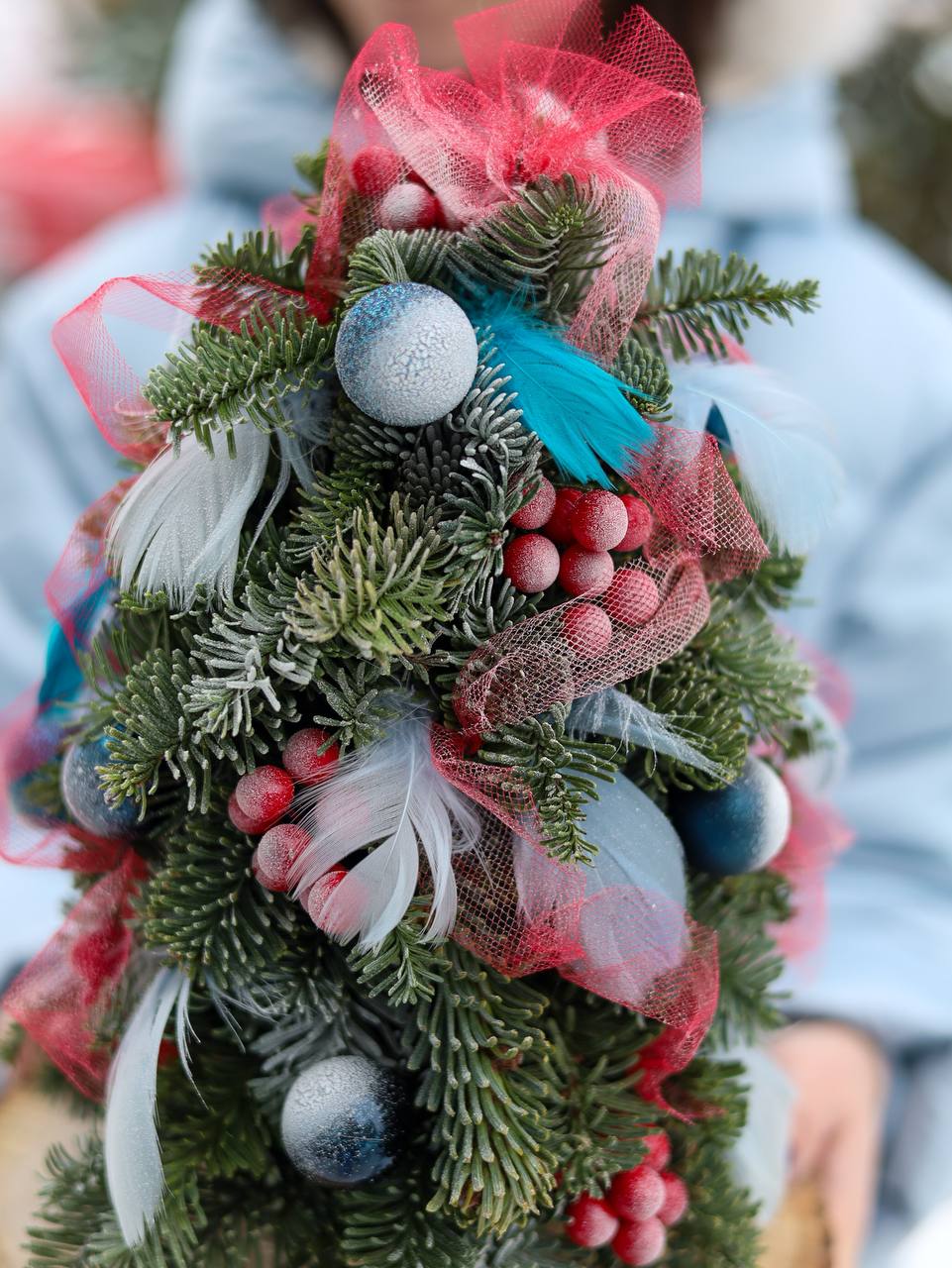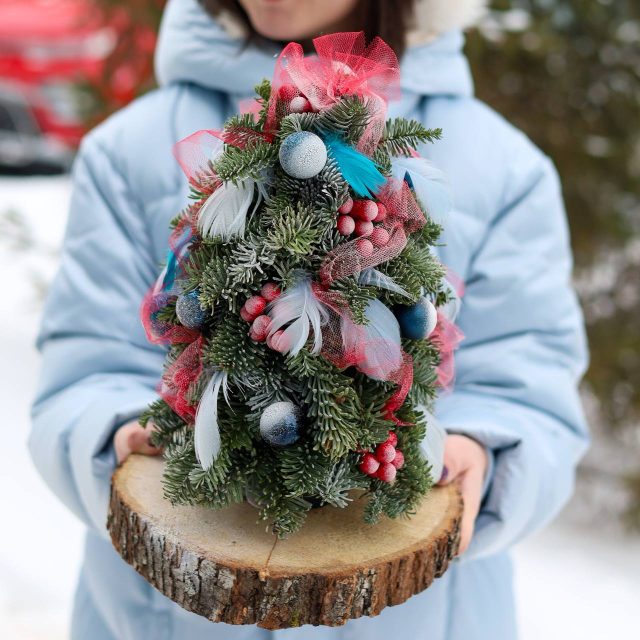 Состав: ель нобилис, елочные игрушки, бусы, декор.