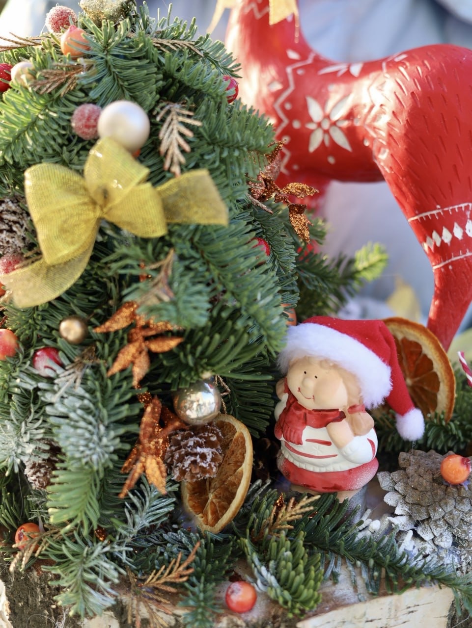 Состав: натуральная ель Нобилис, шишки, декор, куколка, апельсины, фигура оленя.