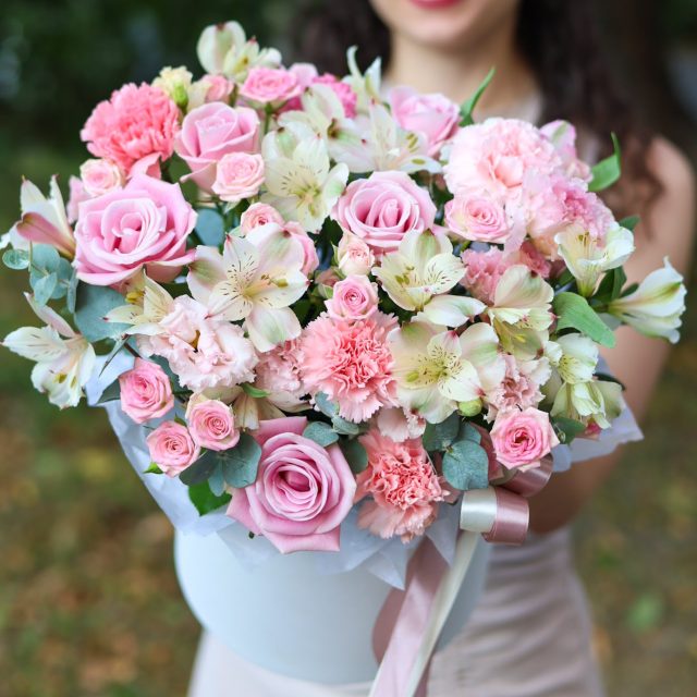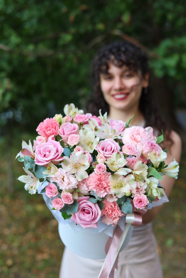 Очаровательная композиция в нежно-розовой гамме в шляпной коробке.