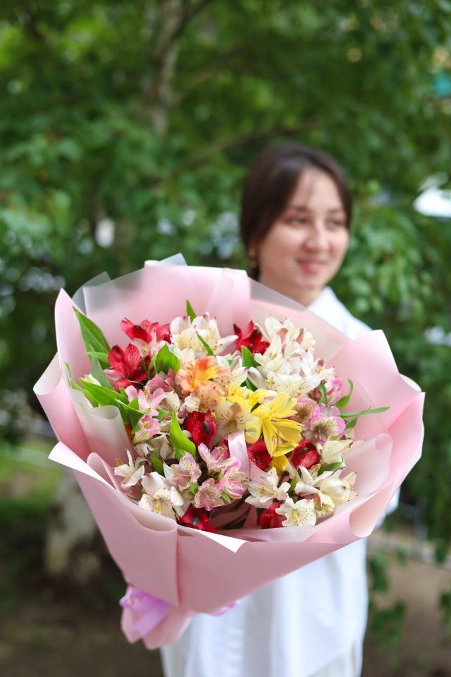 Прекрасный и очень стойкий букет из 19-ти веток высокой альстромерии микс.