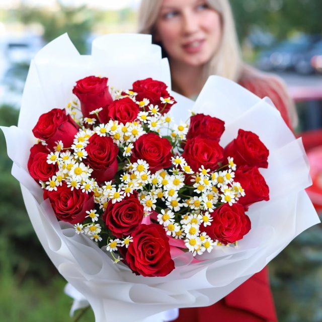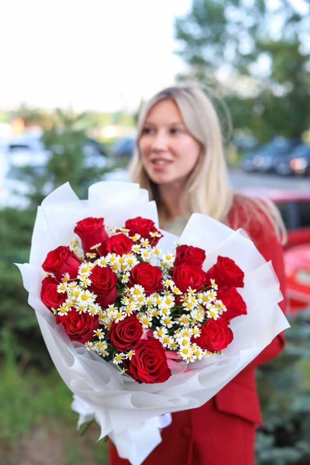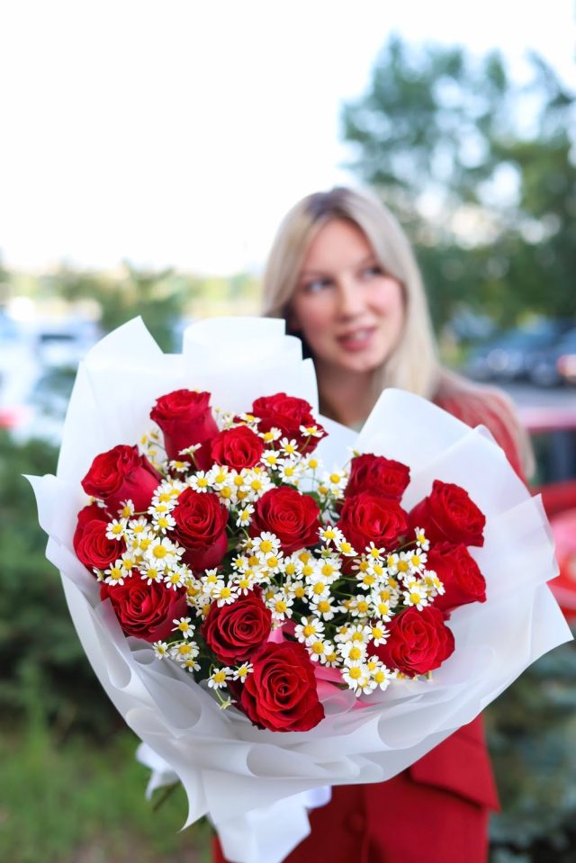 Стильный букет из 15-ти красных роз и ароматных ромашек в дизайнерском воздушном оформлении!