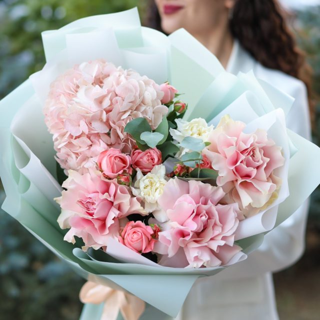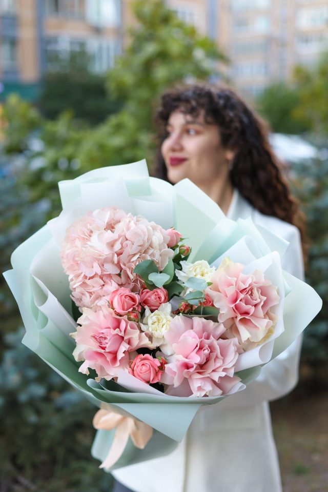 В букете: пышная гортензия, крупные французские розы, кустовые пионовидные розы, стойкие диантусы, эвкалипт.