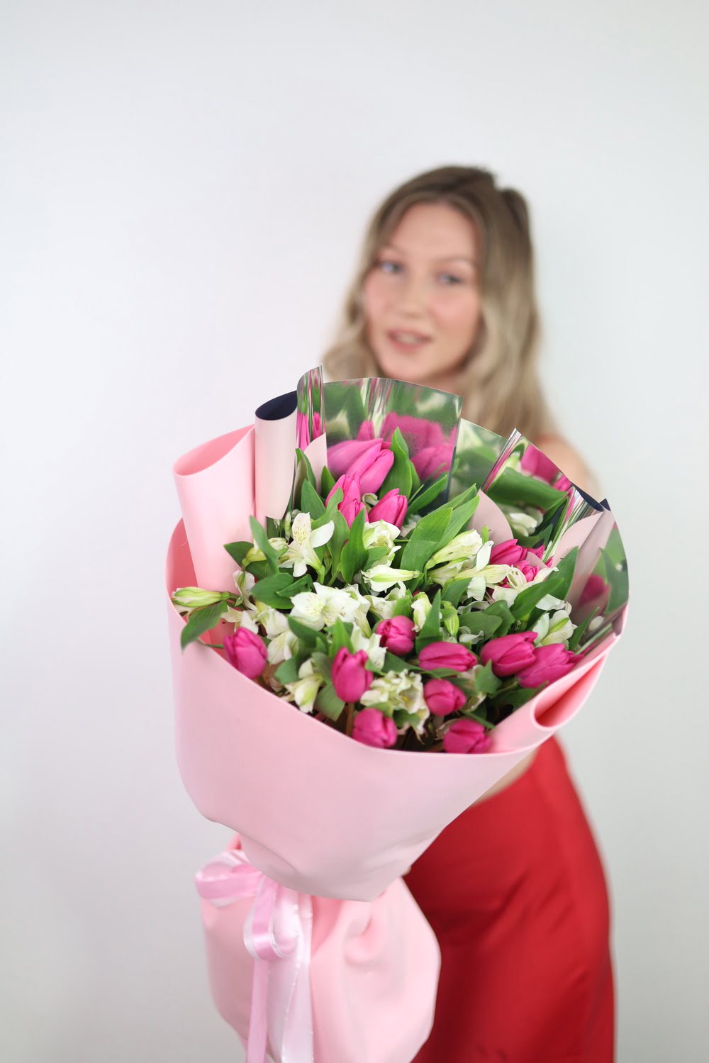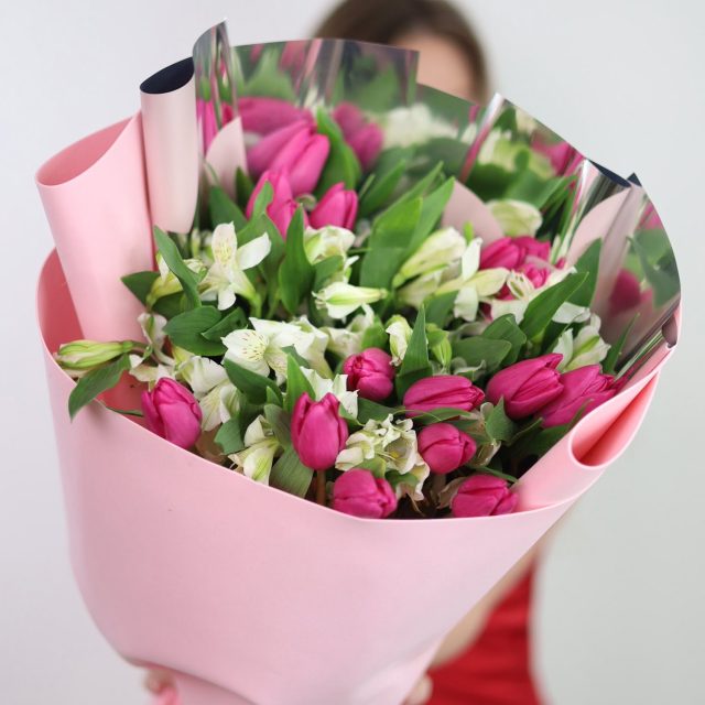 Прекрасный букет сиреневых тюльпанов со стойкой альстромерией в стильном оформлении.