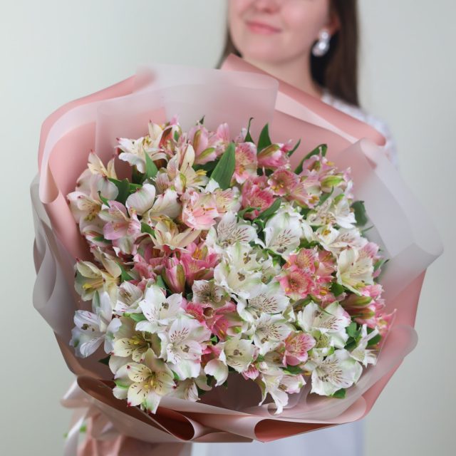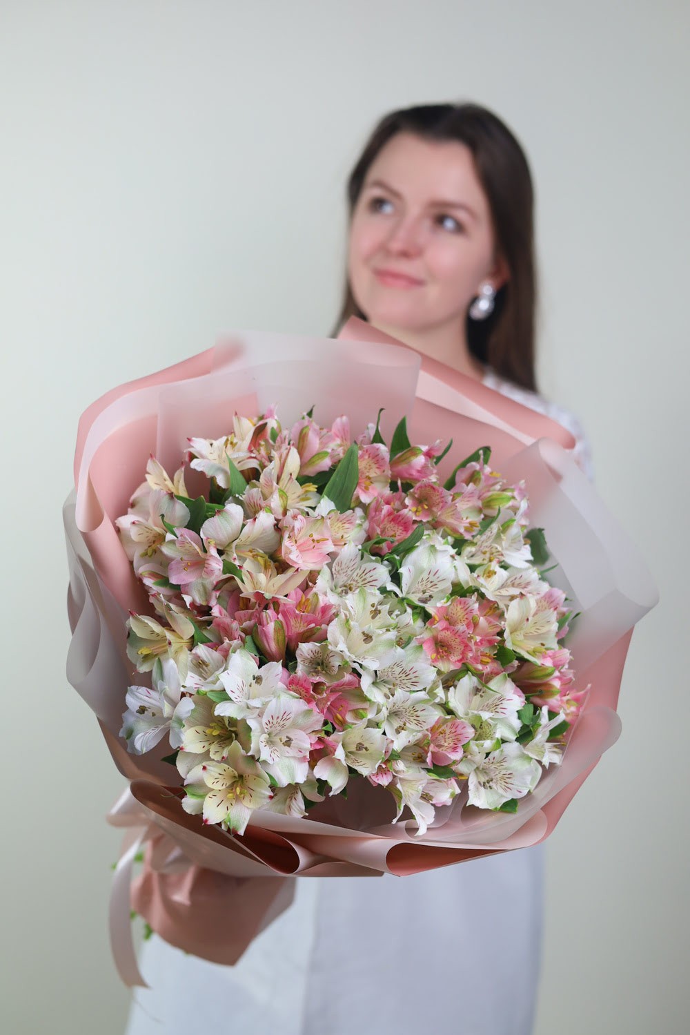 Прекрасный букет из 35-ти веток очаровательных и стойких альстромерией в оформлении.
