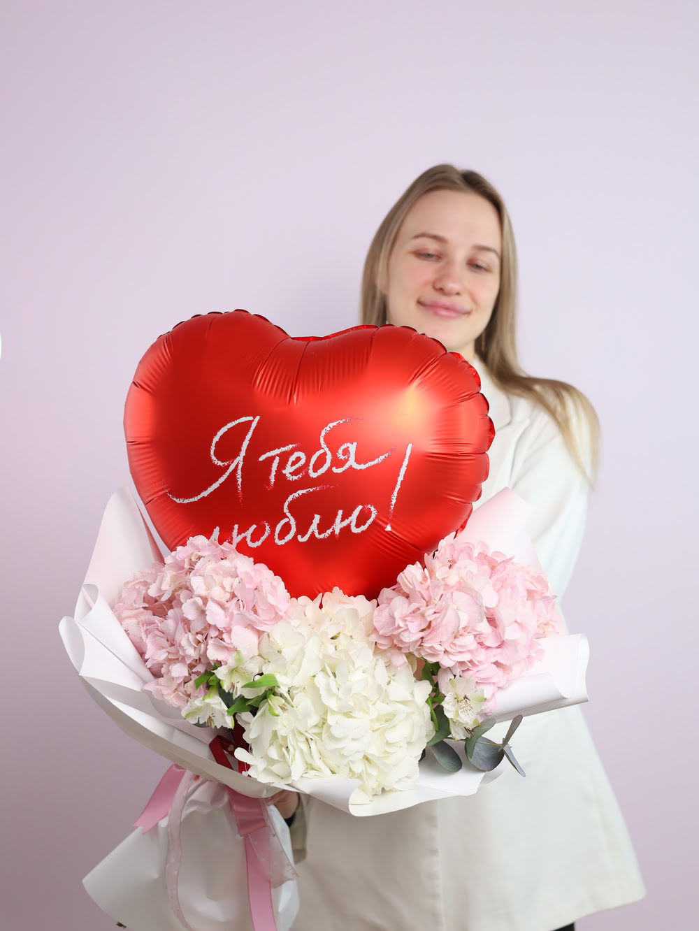 Состав: пышные гортензии, стойкая альстромерия, эвкалипт, шар.