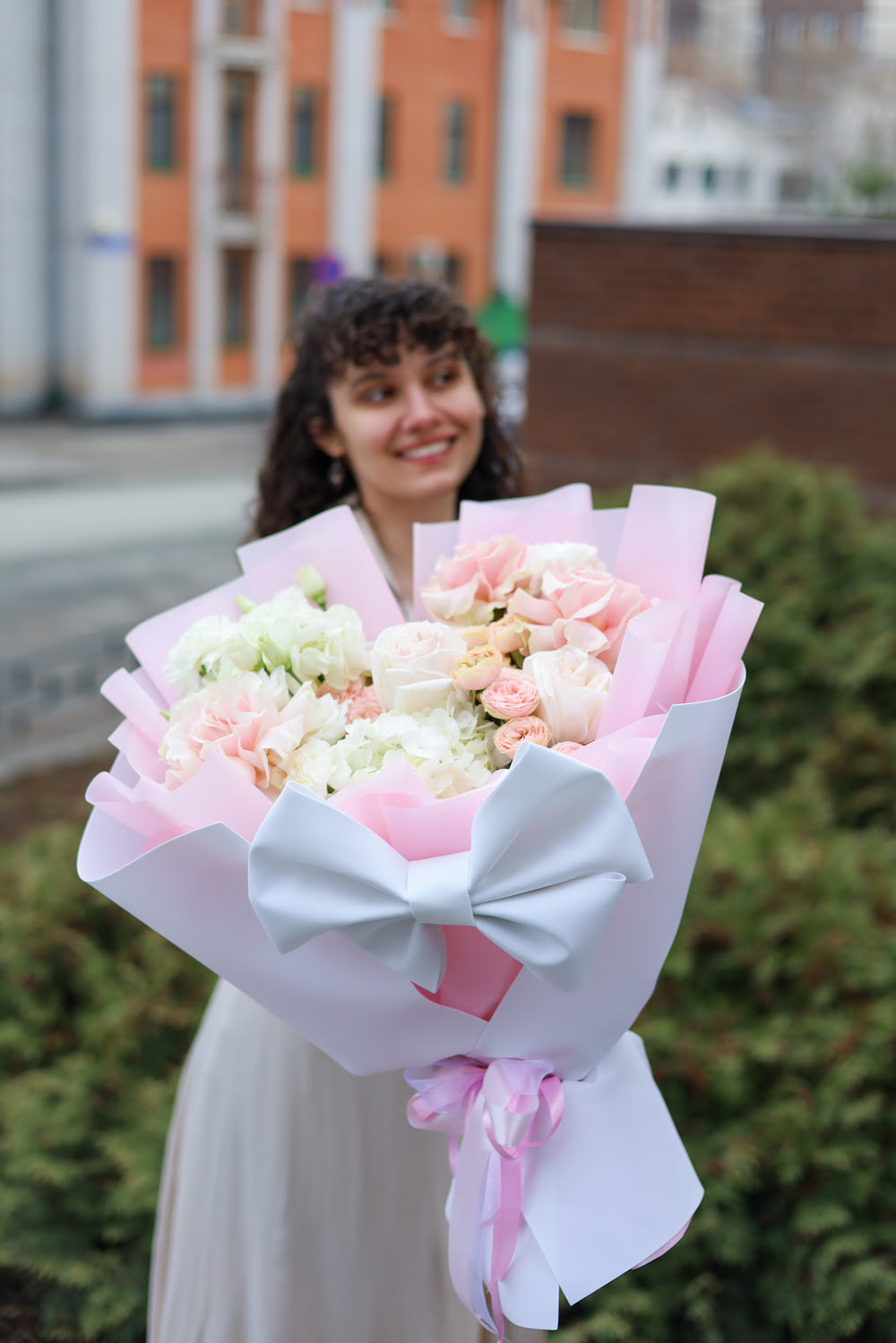 Очаровательный и очень нежный букет в бело-розовой гамме в оформлении. Букет украшен большим бантом и оформлен в корейскую бумагу.