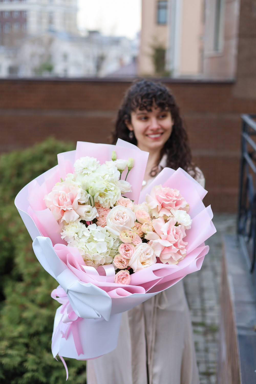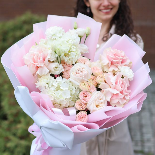Состав: кустовые и одноголовые пионовидные розы, пышные гортензии, французские розы, стойкие диантусы, ажурная эустома.