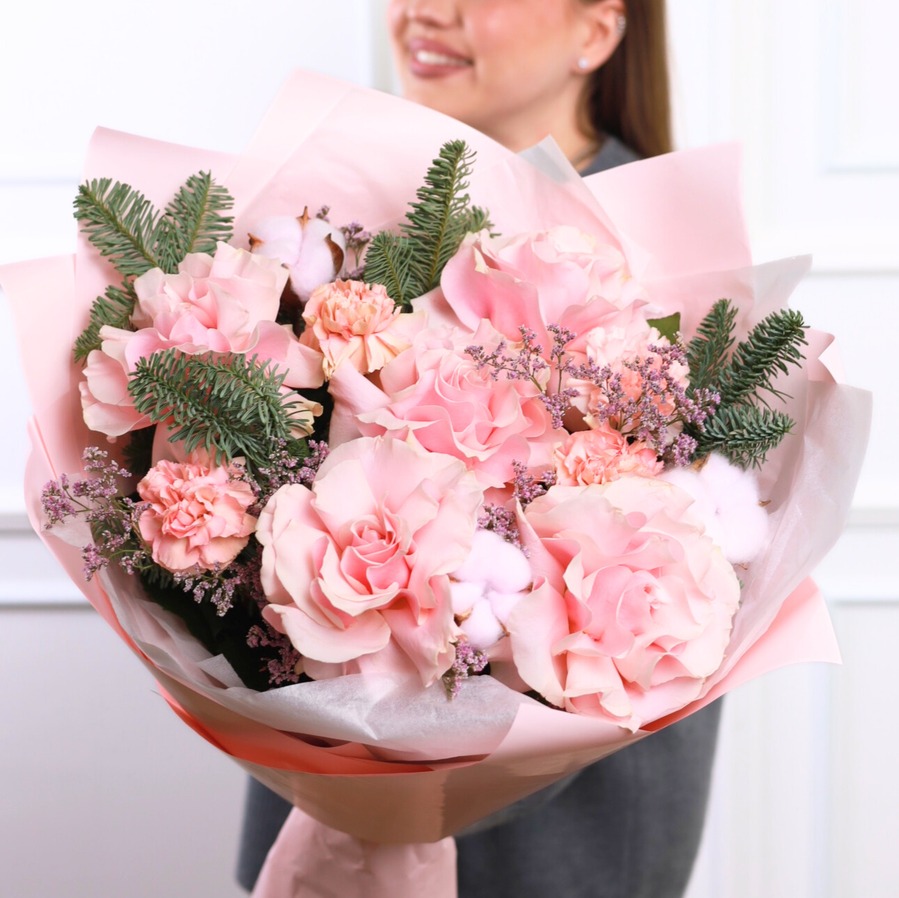 Прекрасный авторский букет с французскими розами, диантусами, хлопком, лимониумом и елью.
