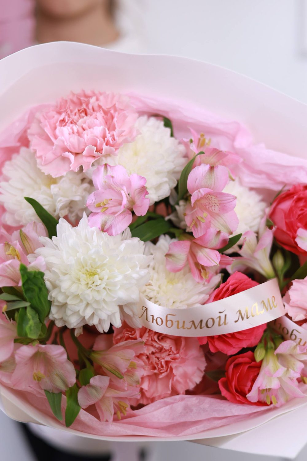 • букет с хризантемами, альстромерией, диантусами, кустовыми розами