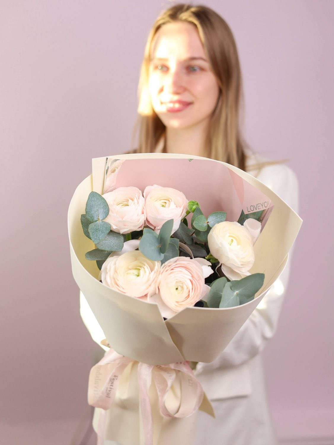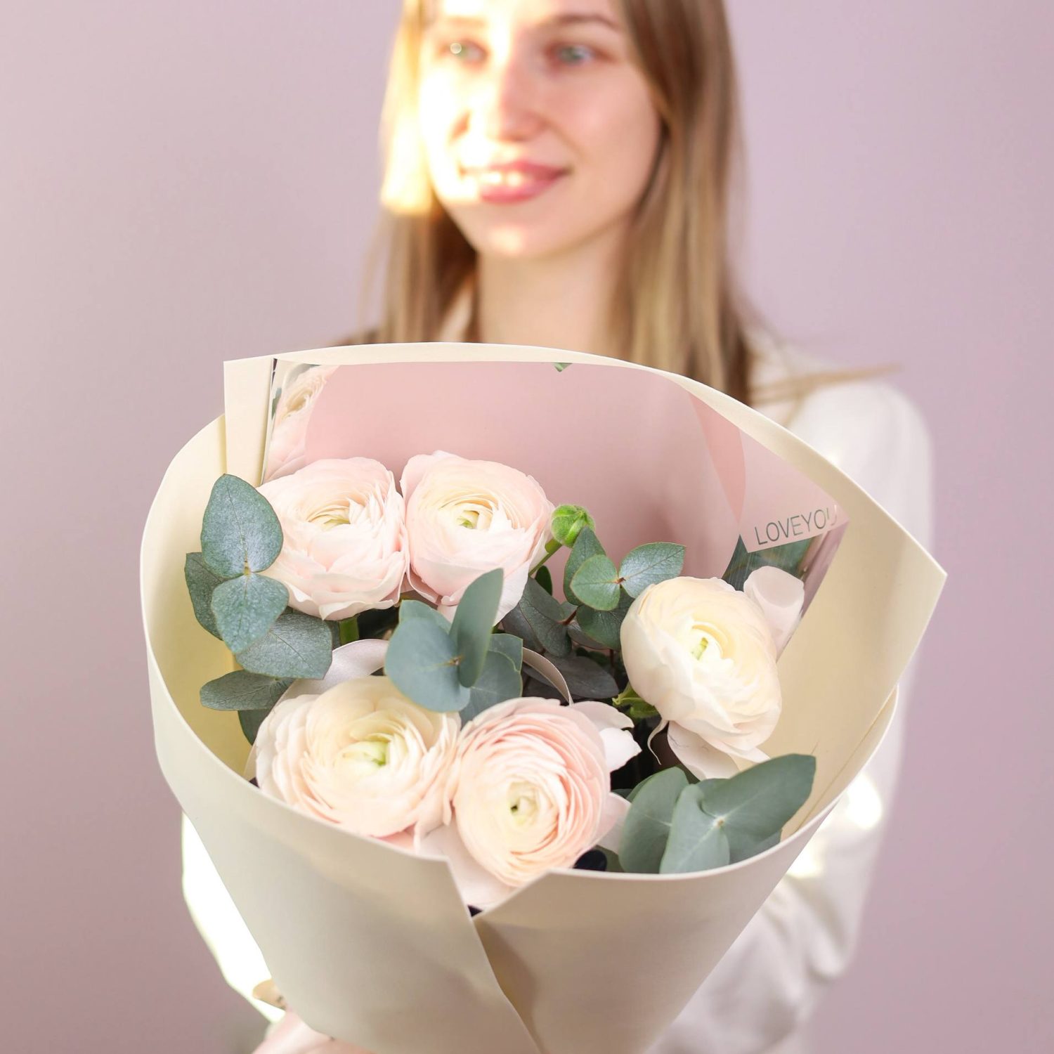 Букет ранункулусов и душистого эвкалипта в оформлении.