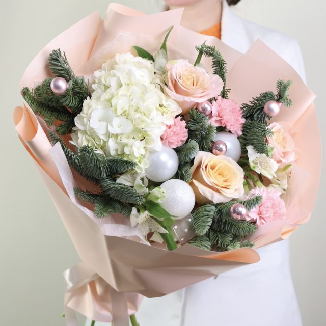 В составе букета: гортензия, стойкие диантусы, одноголовые розы, ель-нобилис, альстромерия, новогодний декор.