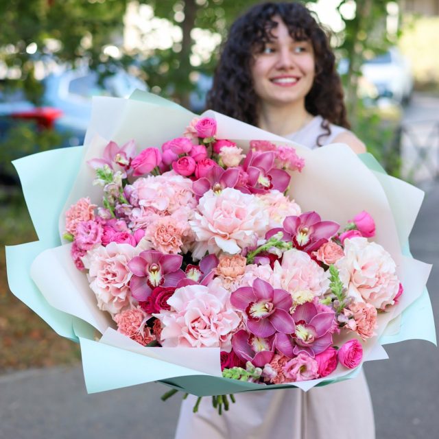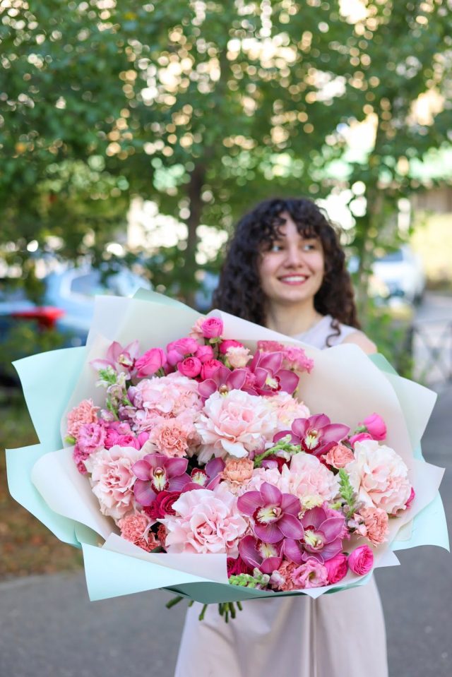 Состав: стойкие орхидеи и диантусы, французские розы, пышные гортензии, антирринум, кустовые пионовидные розы, ажурная эустома.