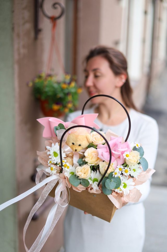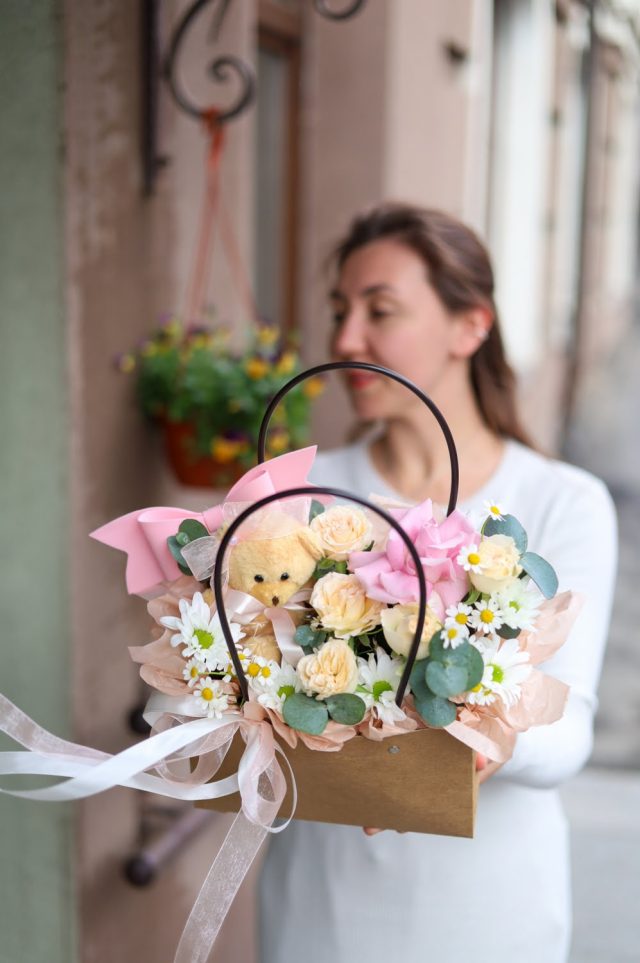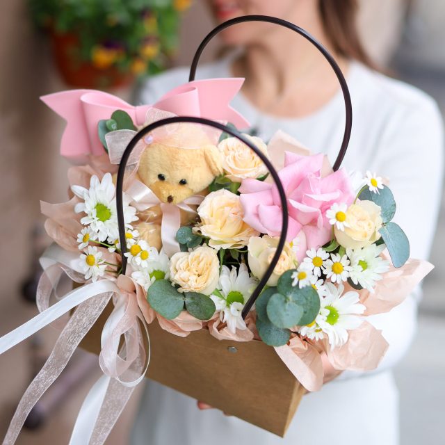 Милая композиция в сумке с ручками с плюшевым мишкой в персиковой гамме.