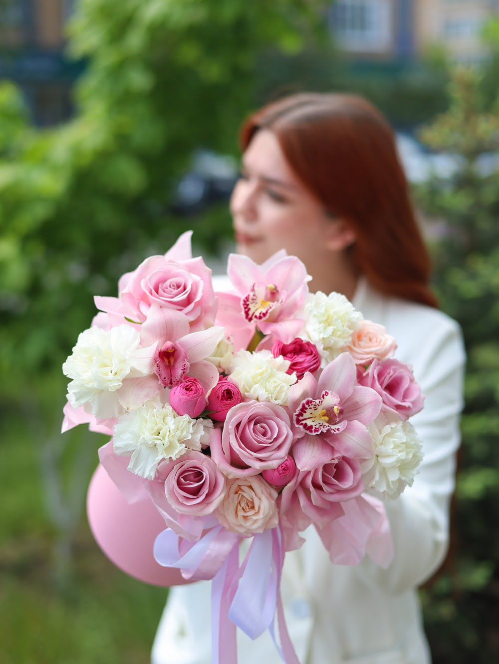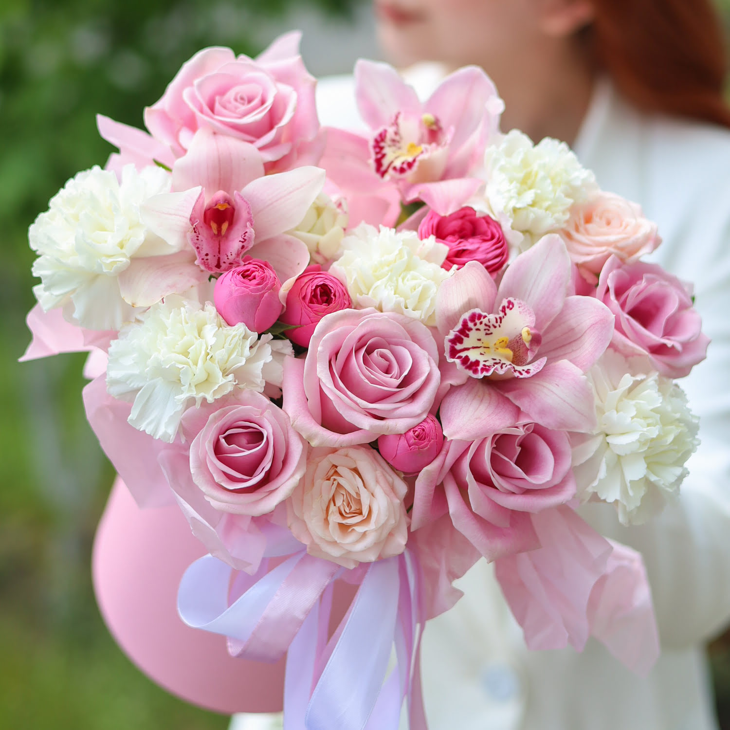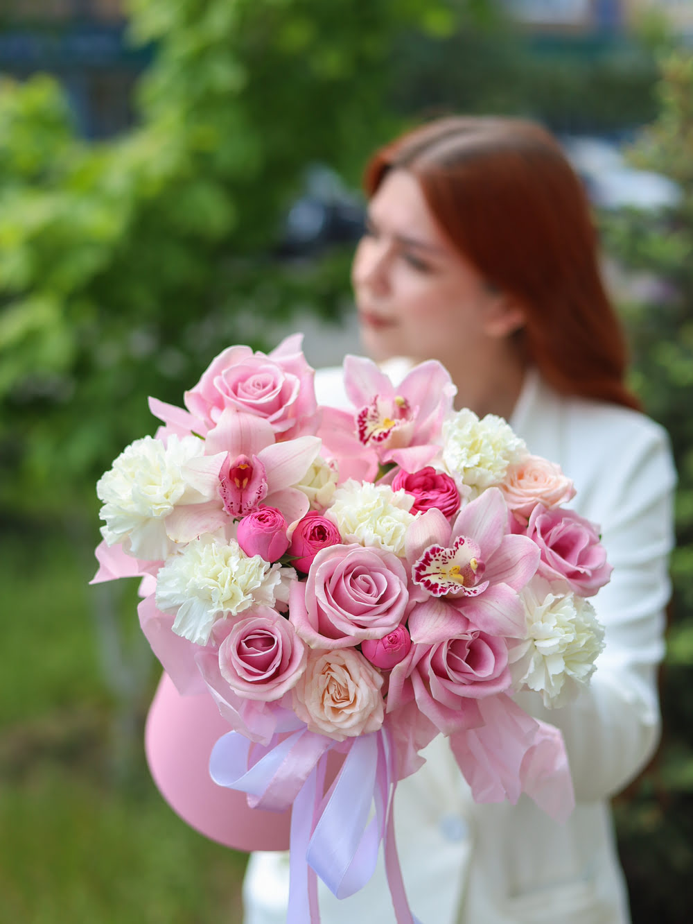 Состав: одноголовые розы, стойкие диантусы и орхидеи, кустовые пионовидные розы.