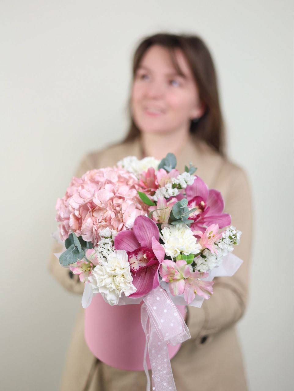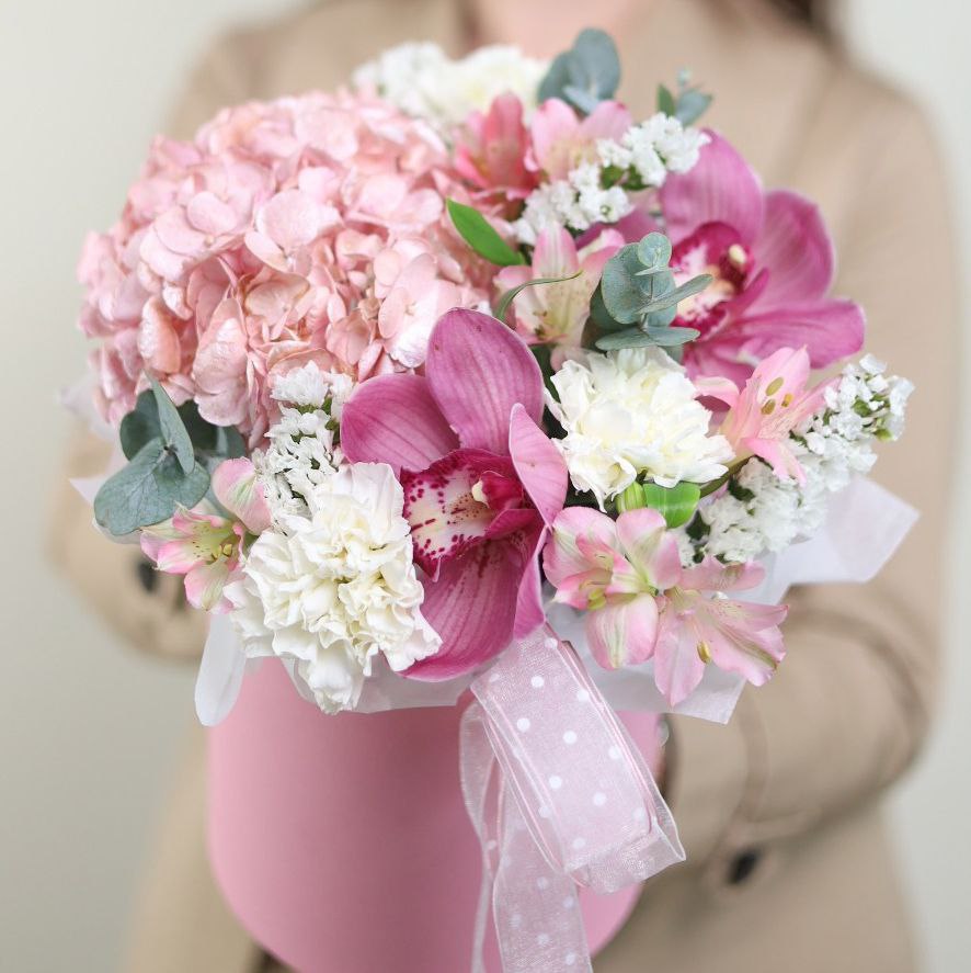 Композиция с пышной гортензией, орхидеей, альстромерией, стойким диантусом, статицей и эвкалиптом в шляпной коробке.