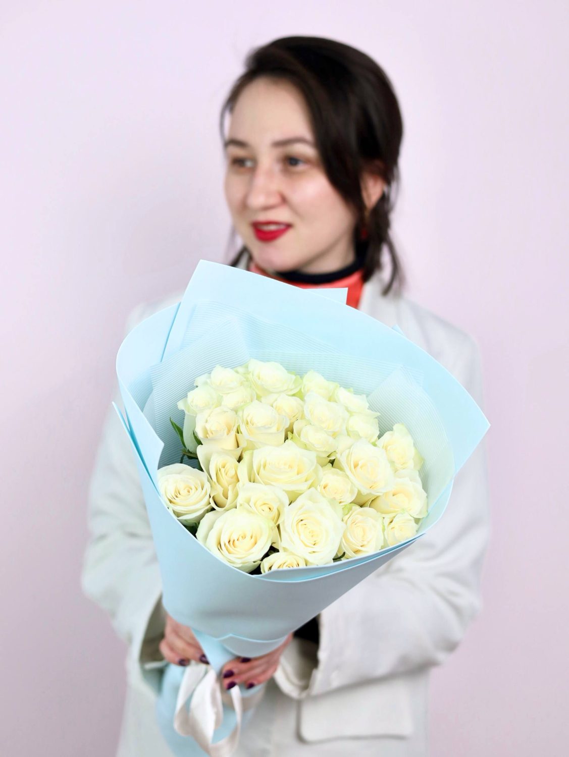 Прекрасный букет из 25-ти белых роз в стильном оформлении.