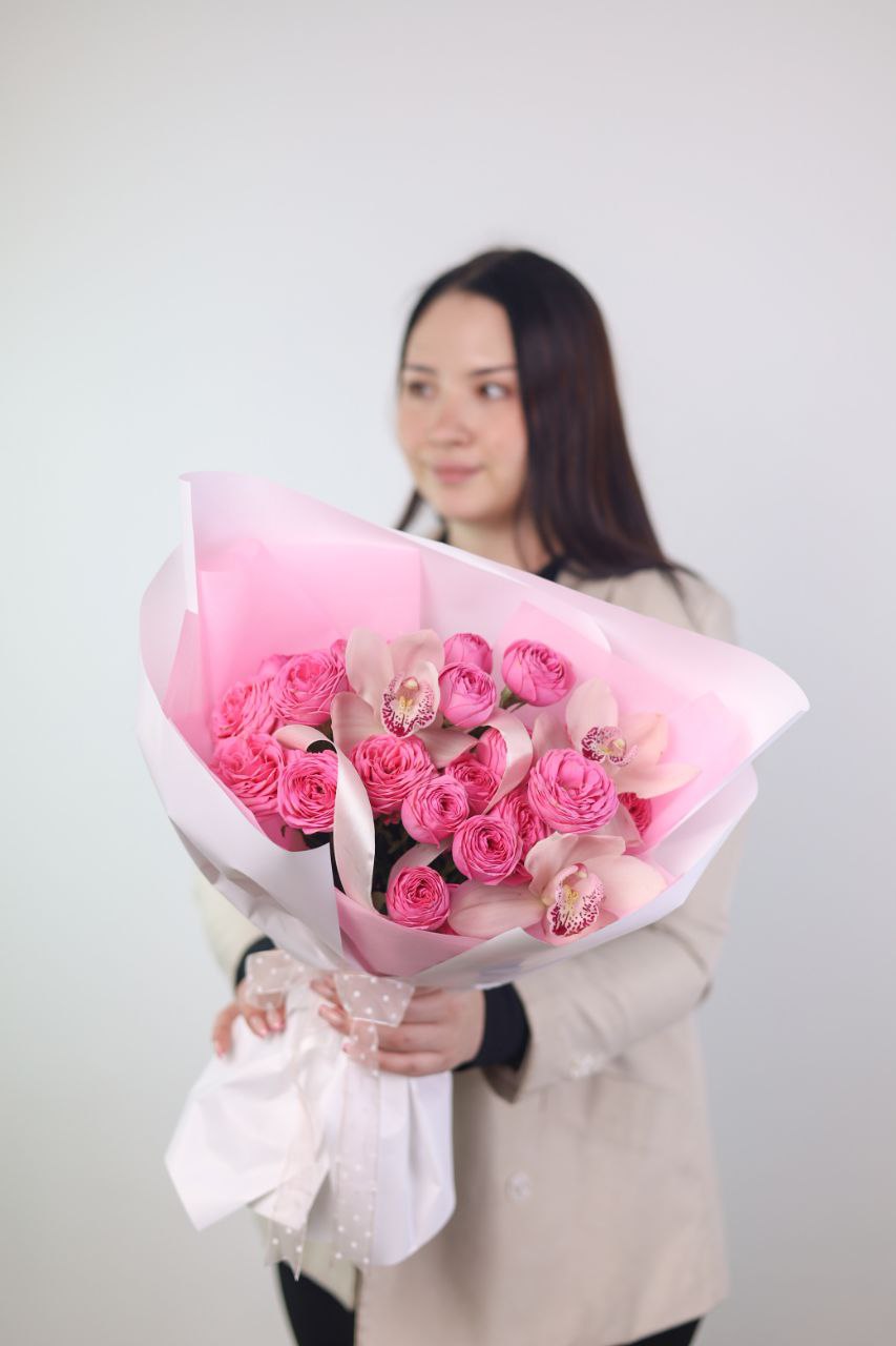 Нежный букет кустовых пионовидных роз и орхидей в оформлении.