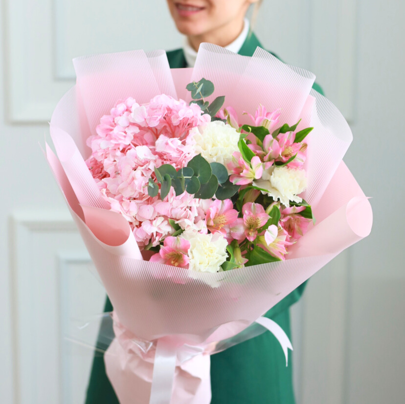 Состав: пышная гортензия, стойкие диантусы и альстромерия, эвкалипт.