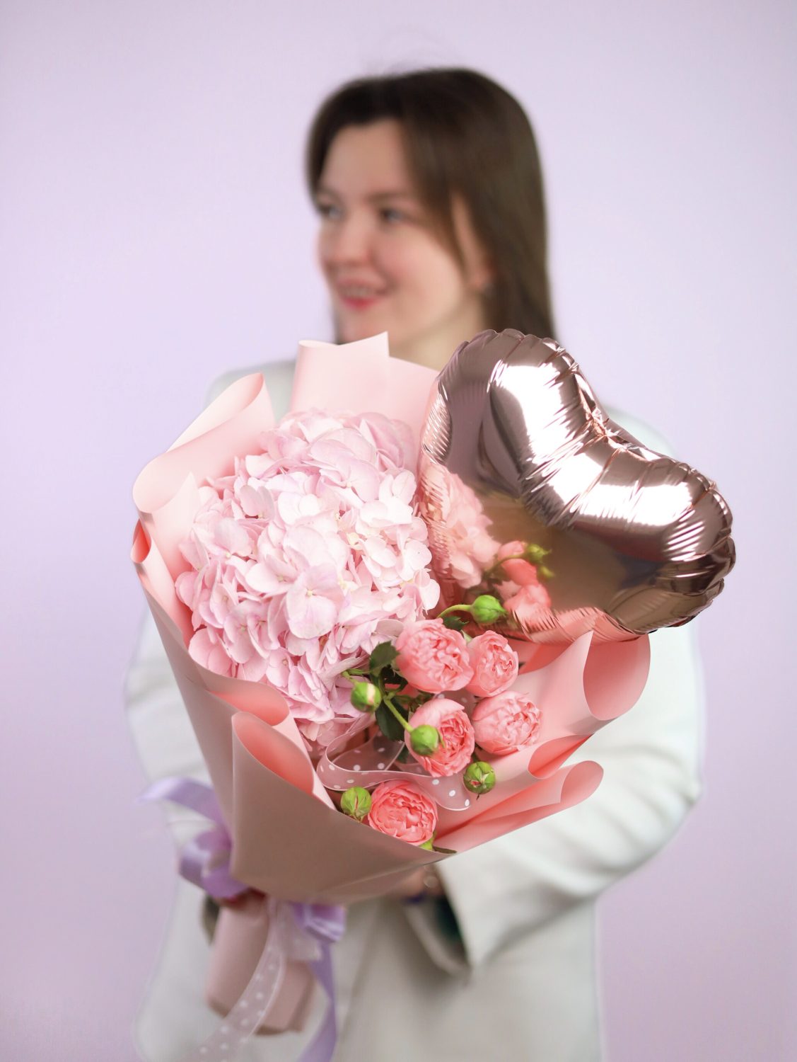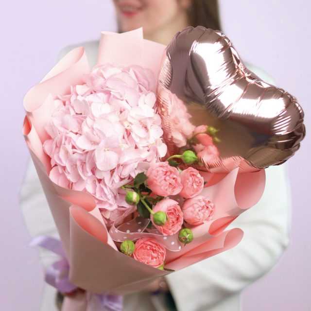 Состав: пышная гортензия, кустовая пионовидная роза, шар.