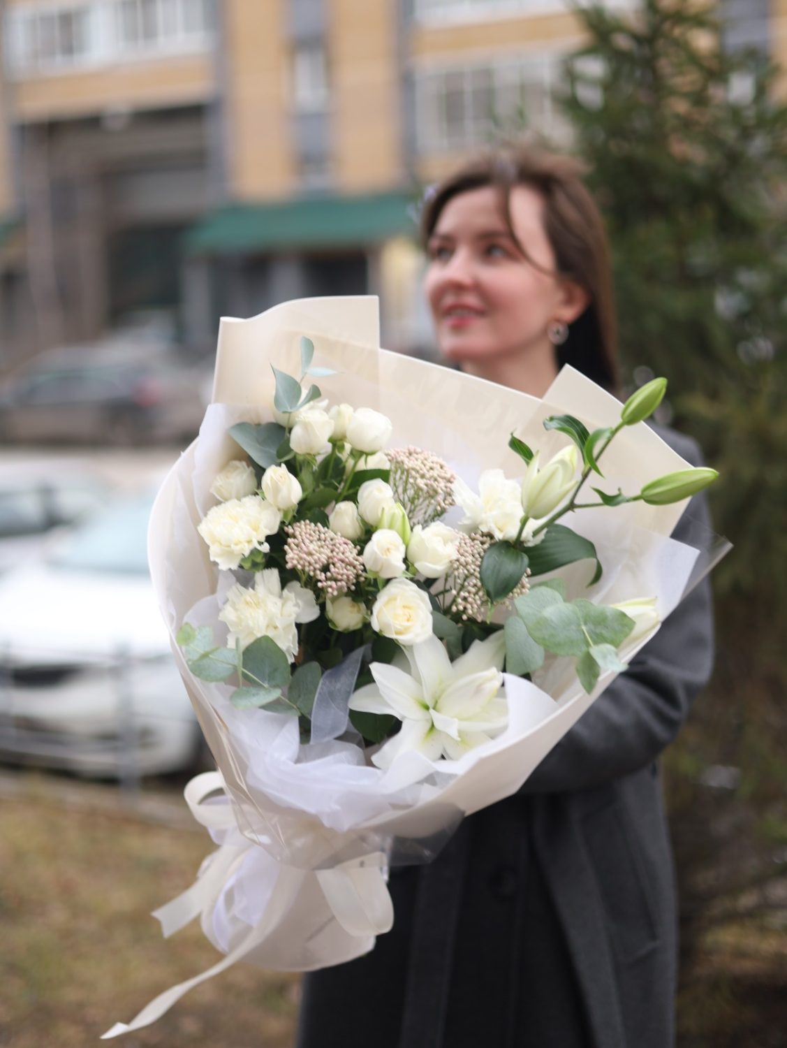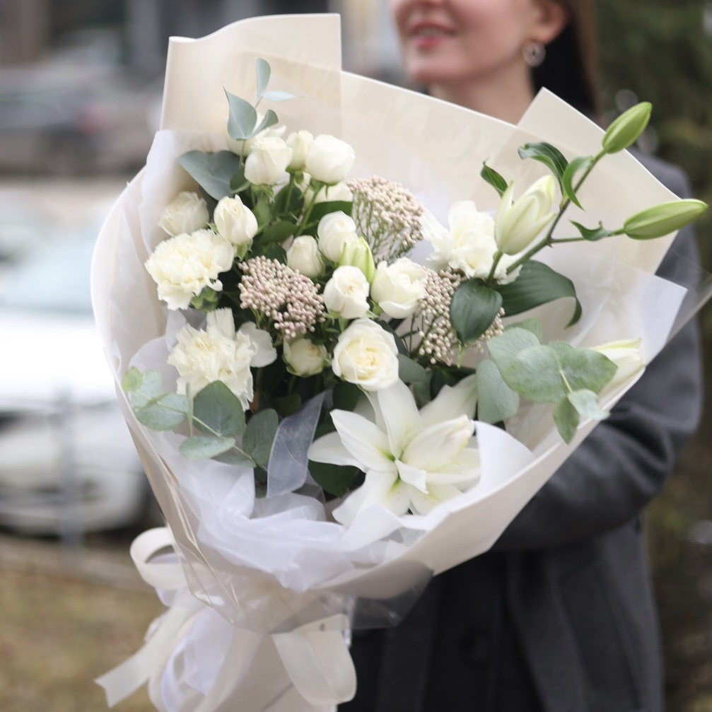 В составе букета: лилия, озотамнус, кустовые розы, эвкалипт, стойкие диантусы