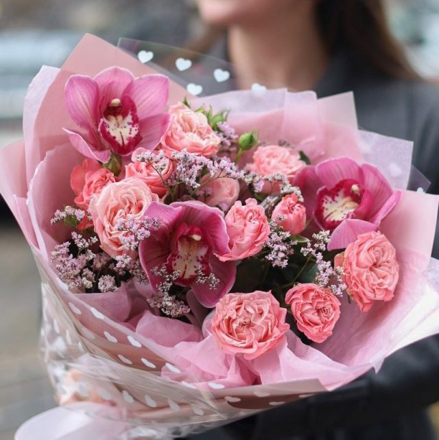 Букет стойкой орхидеи, пионовидной кустовой розы и лимониумом в оформлении.