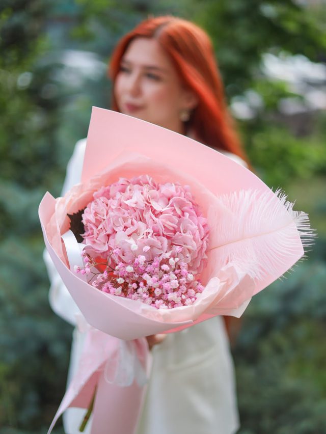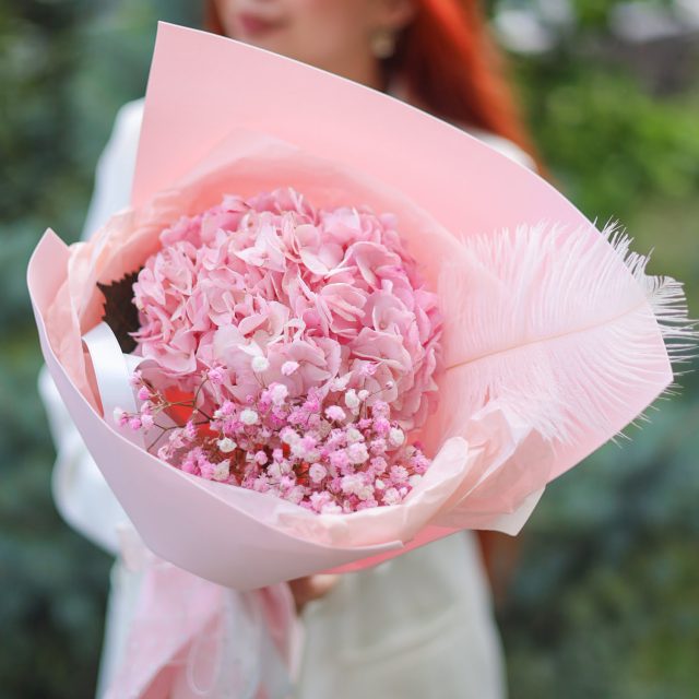 Состав: пышная гортензия, стойкая гипсофила, декоративное перо.