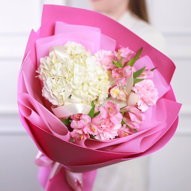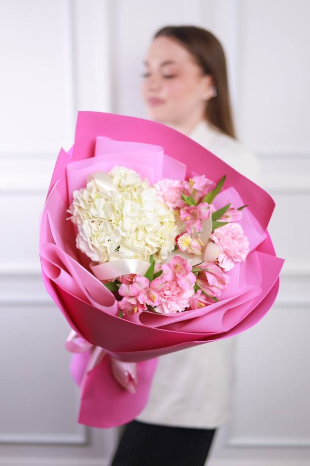 Состав: гортензия, стойкие диантусы, альстромерия и орхидея.