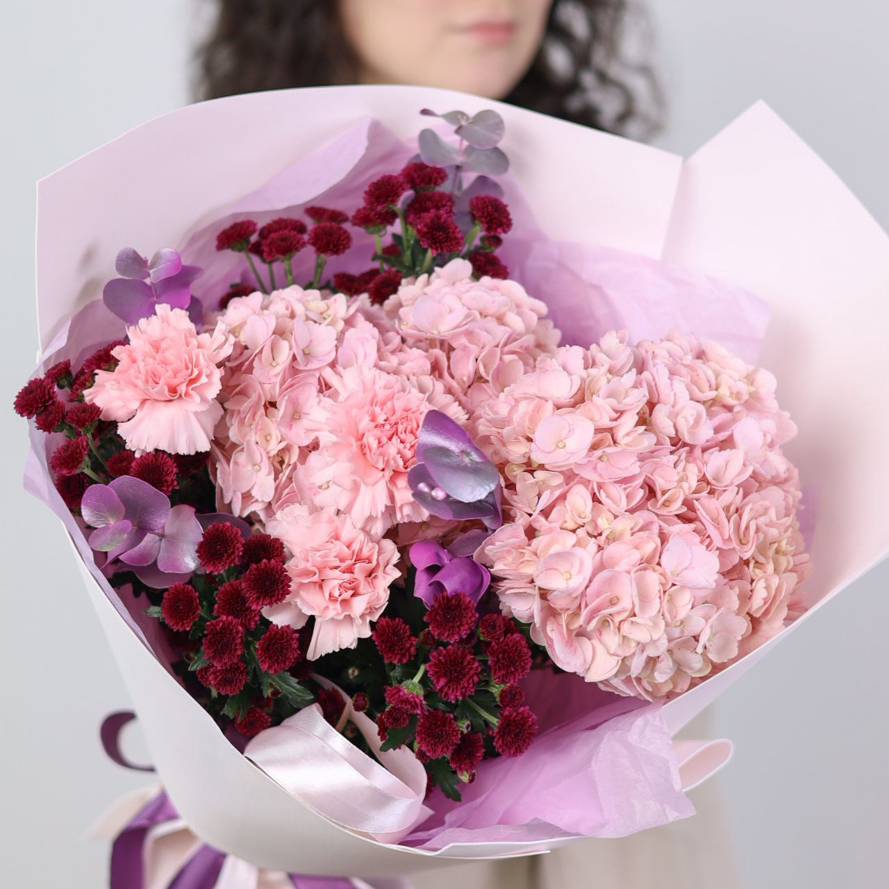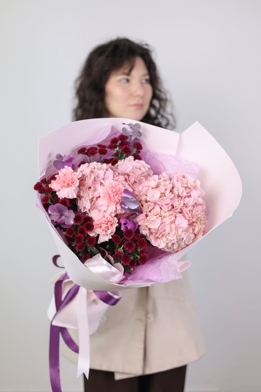 Букет с пышной гортензией, стойким диантусом, хризантемой и эвкалиптом в оформлении.