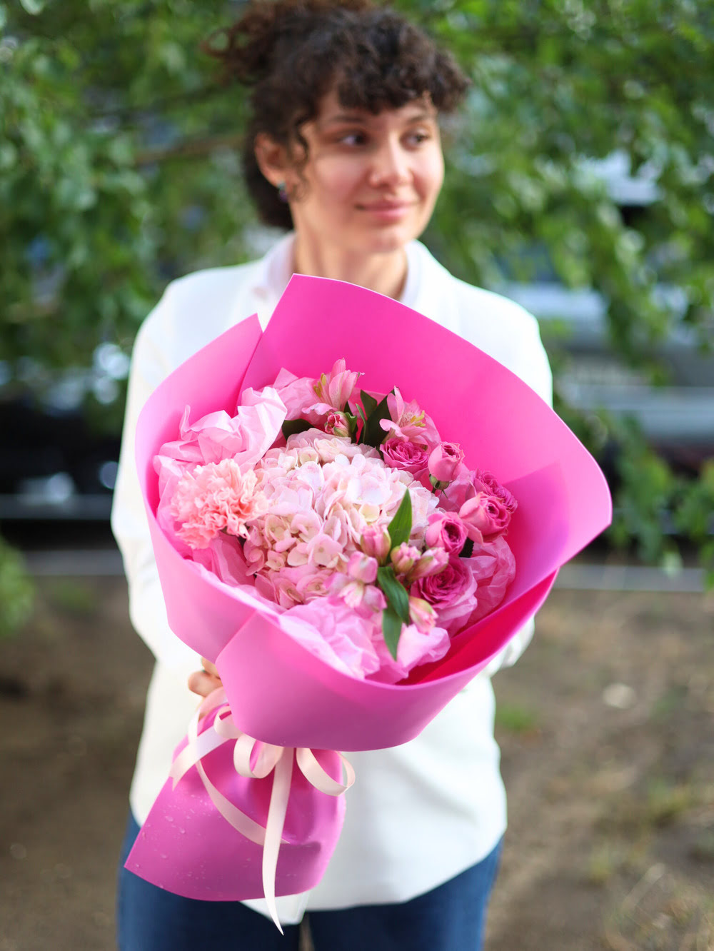 Очаровательный букет с розами и гортензией