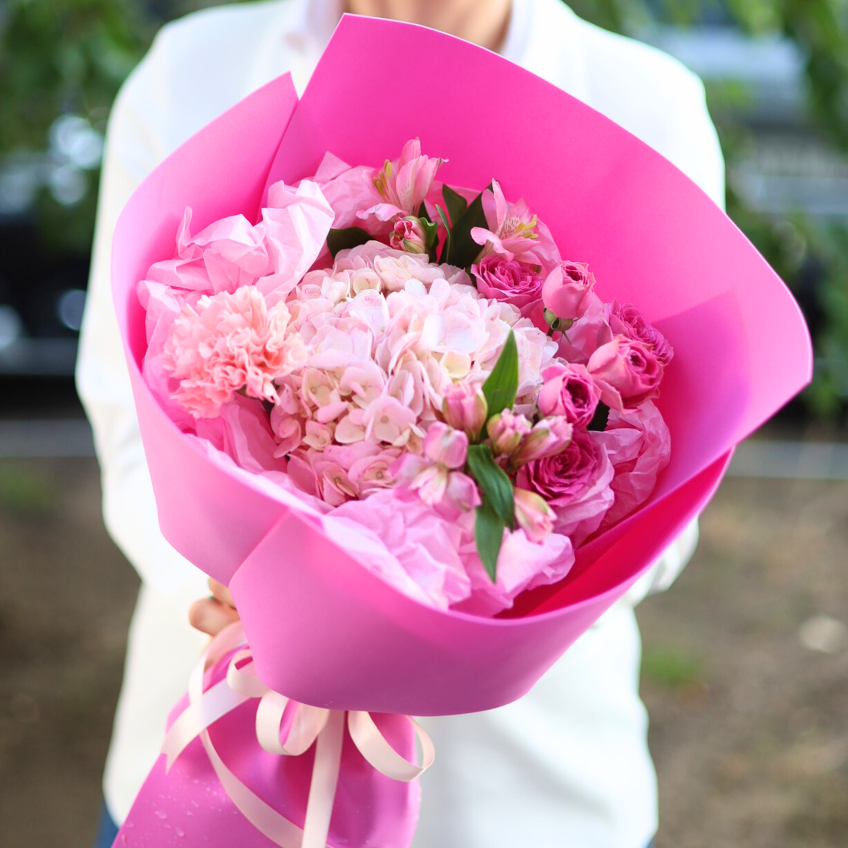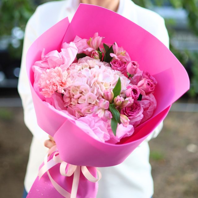 Состав: пышная гортензия, кустовые розы, стойкие альстромерия и диантус.