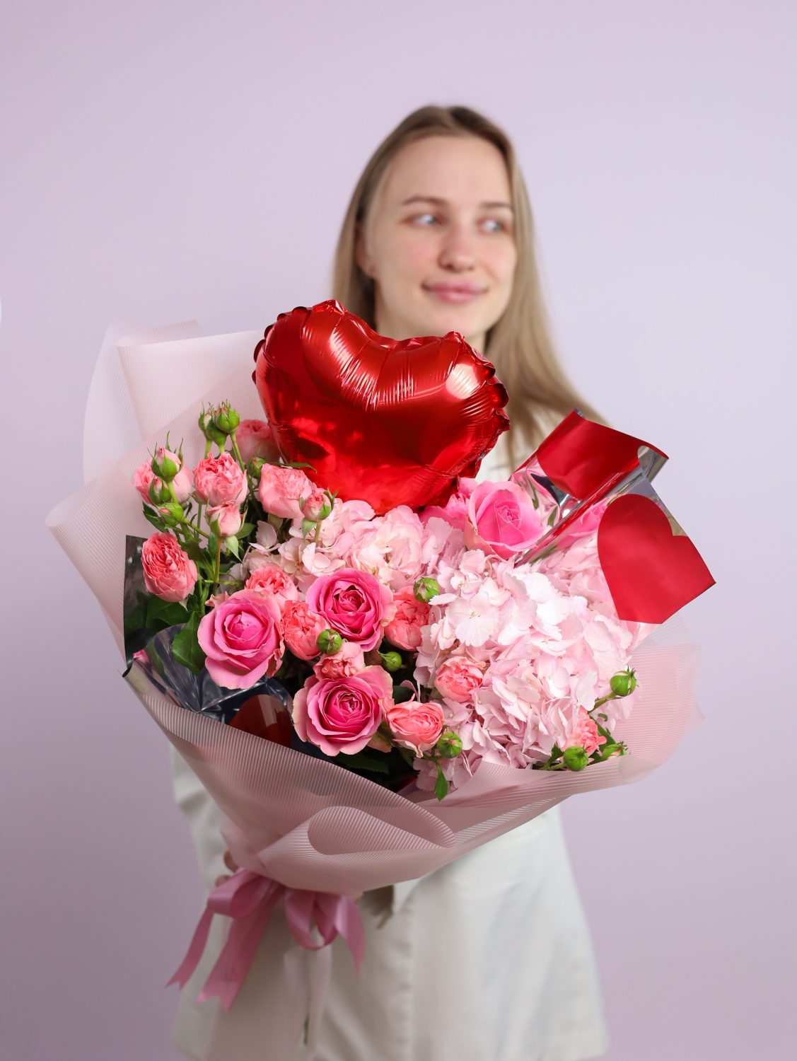 Состав: пышные гортензии, одноголовые и пионовидные розы, шар.