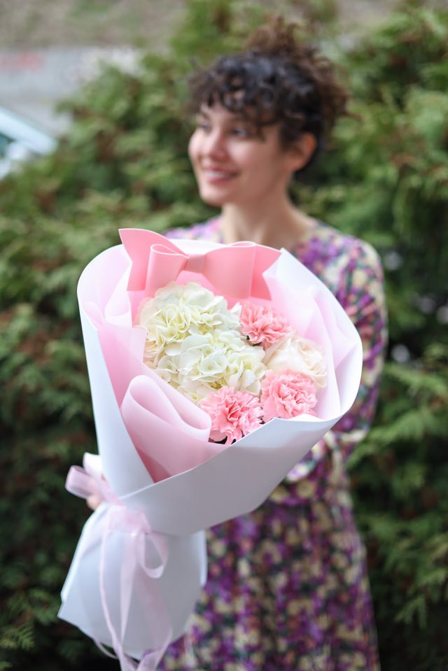 Состав: пышная гортензия, стойкие диантусы, одноголовая пионовидная роза.