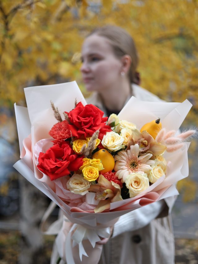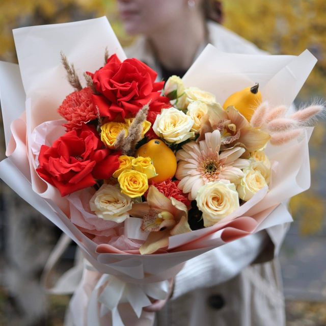 Букет с французскими розами, кустовыми розами, орхидеями, герберой, диантусами, тыквами, лагурусом и сухоцветами в оформлении.